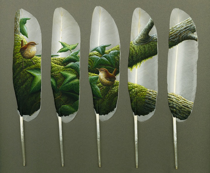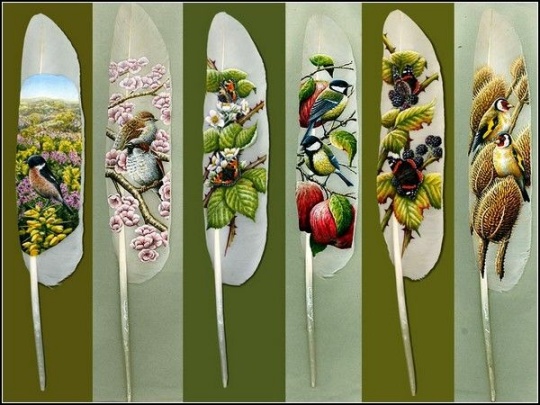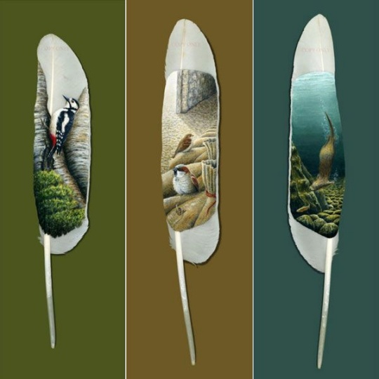 How beautiful are these? One of the elements that can make the art of painting so exciting is the artist's choice of canvas. Ian Davie's decision to paint on swan feathers has given him some major recognition.