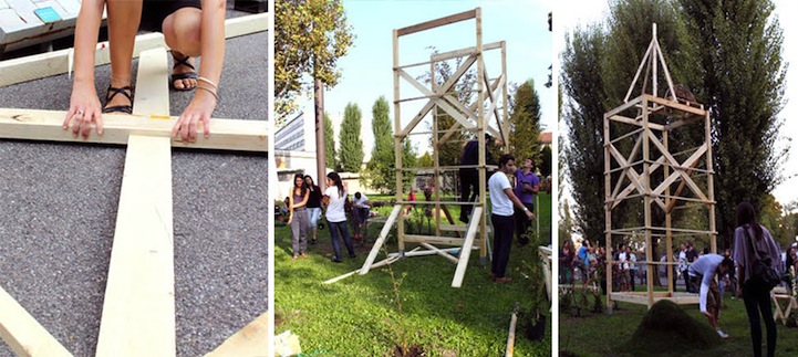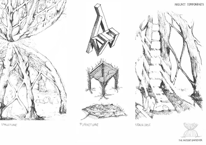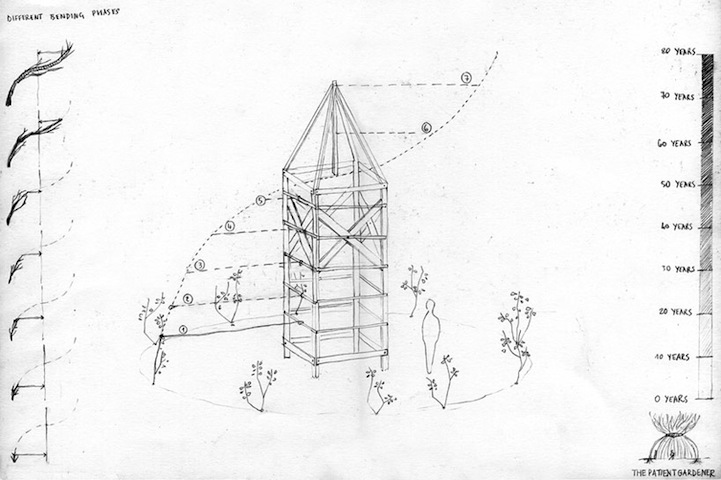 “Our intention with our project was to construct a study retreat at the campus with patience as the main key for the design,” said the participants at the Visiondivision workshop.”As time passes the trees will form a dome when they reach the tower, and then designated by to change its direction so the final form will be an hourglass, a suiting shape for the project and also a very practical form.”