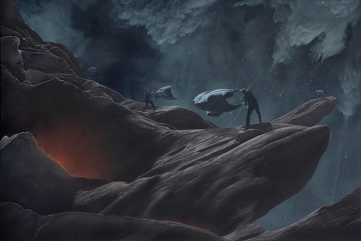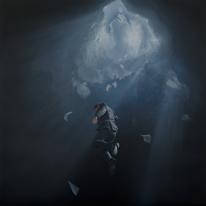Is man battling nature or himself? In these fascinating new paintings by artist Joel Rea, we see man and a tiger going one-on-one with the fury of nature. Using oil on canvas, Rea makes his paintings come alive by showing waves furiously crashing and rocks shockingly crumbling. One has to wonder who has ultimate control in this world. In Resolution, above, we see a man holding a briefcase in one hand and a piece of paper in the other, while a giant wave is about to crash upon him. Solemn or scary? Are you at peace with this painting or does it make you quiver inside? Like any great art, that's up to you to decide.