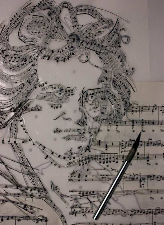 What better way to pay tribute to one of the greatest composers of all time than with a portrait using his own music? Earlier last year, Erika Iris Simmons embarked on a neat project. She would carefully cut up two full pages of second-hand sheet music with an X-acto knife, keeping all the bits of music as intact as possible. Then, she aligned the remainder of the two pages over her rough outline. Her goal was to make it “look as if [Beethovan's] bust is erupting out of the pages.” Musical bars made basic contours of the face and curls of the hair.