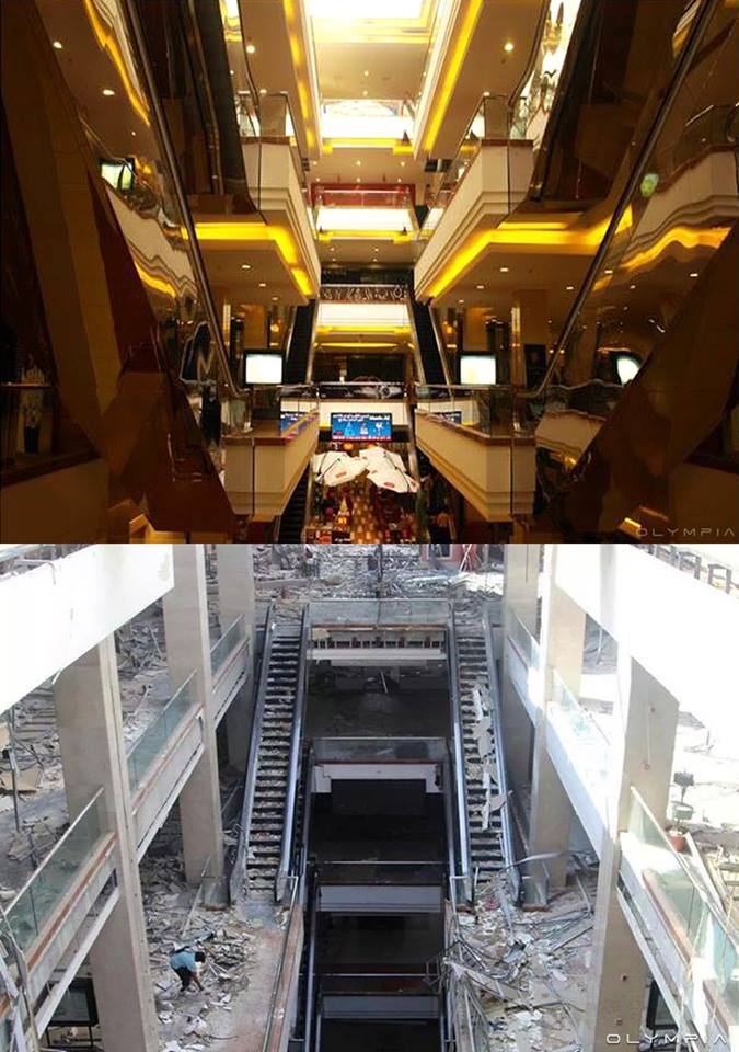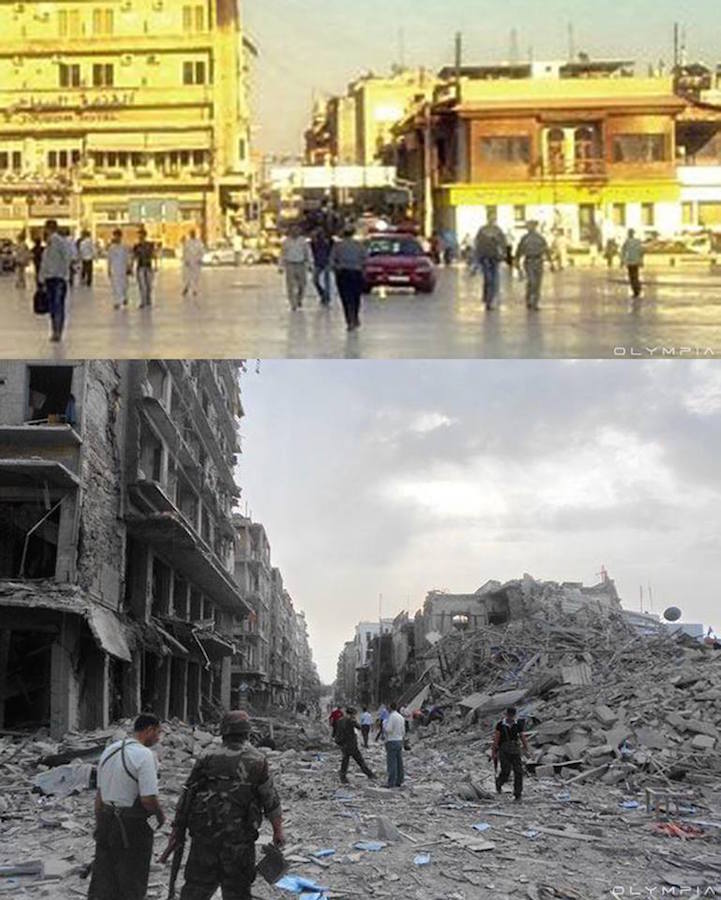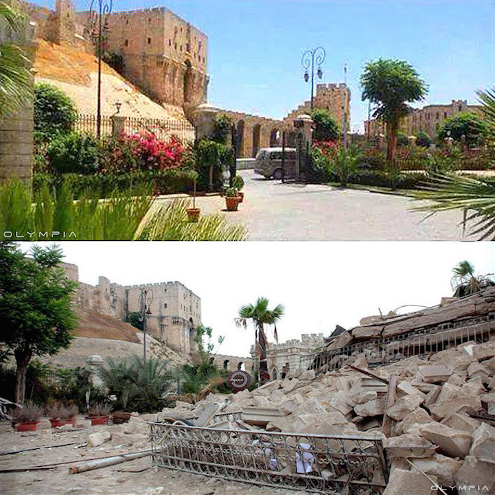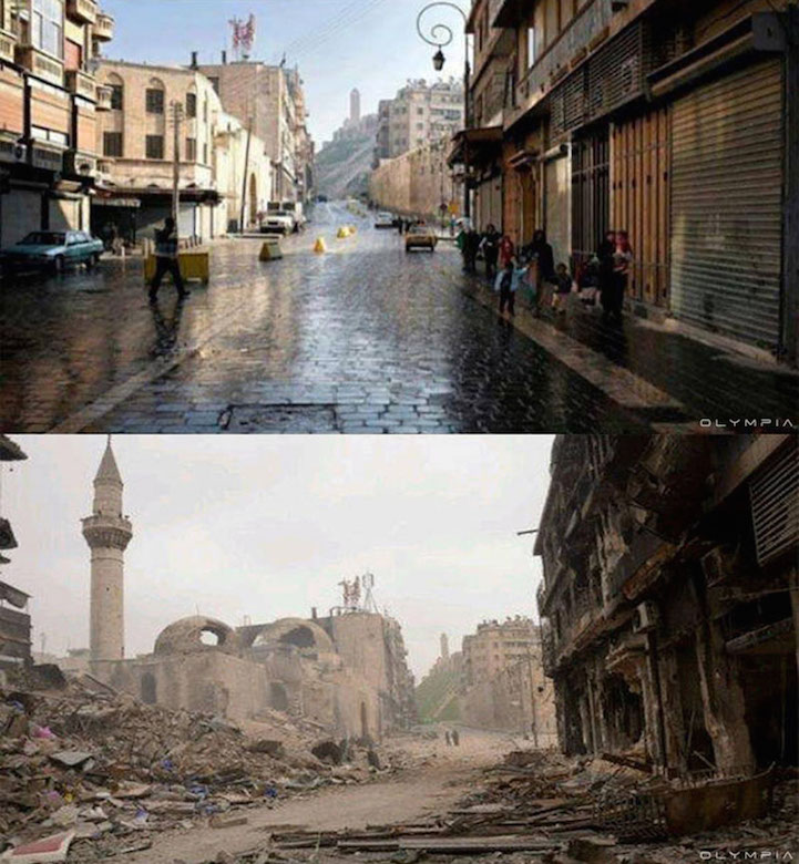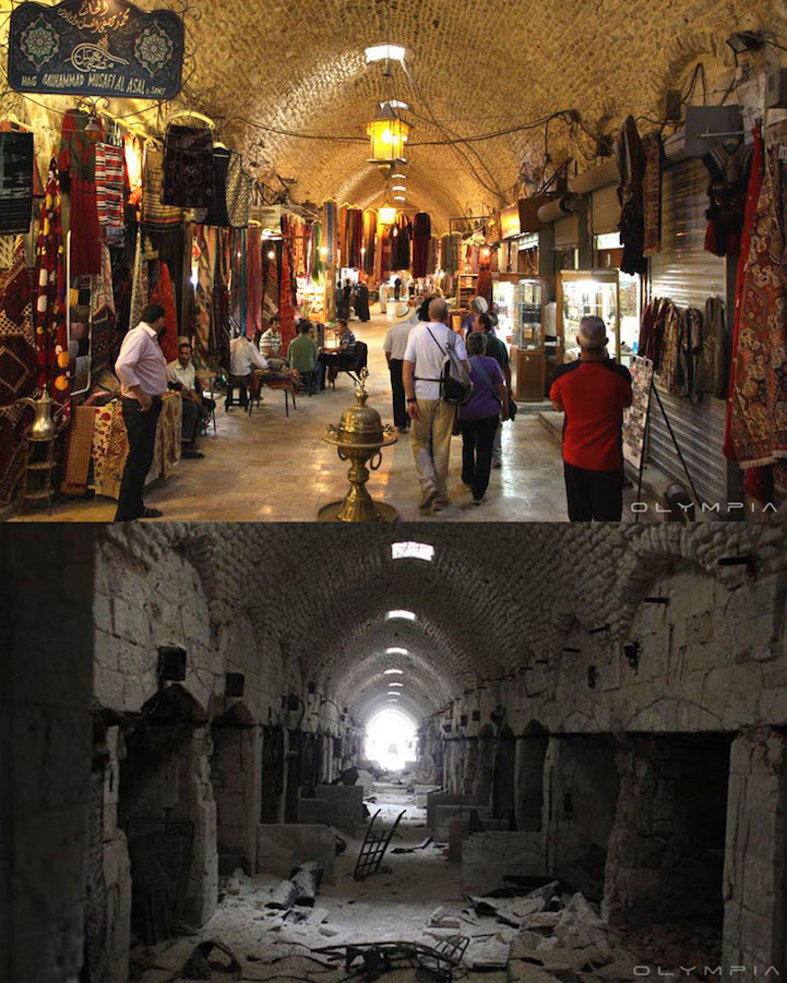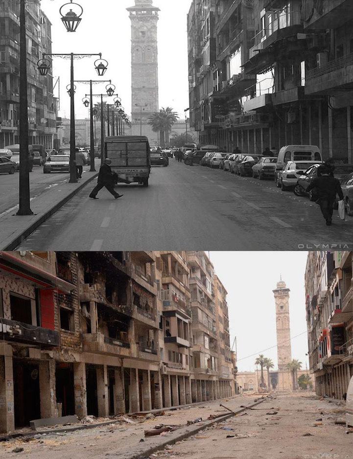 Aleppo's own Olympia Restaurant has just released a collection of before-and-after photographs, showing the once-vibrant and lively cityscapes alongside the same locations, now devastated by rubble and war. On Facebook, the restaurant wrote: “These 124 images show our beloved city, how it was, and how it is now after sabotage, destruction, looting and burning of the monuments, historical places, old houses, mosques, churches and the historical old markets (Souks) which are classified as Sites of World Heritage by UNESCO since 1986.”