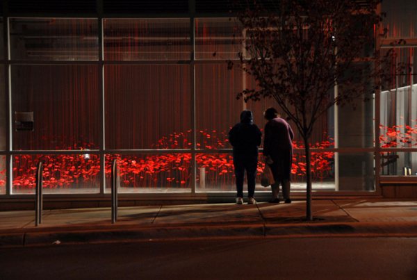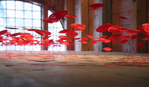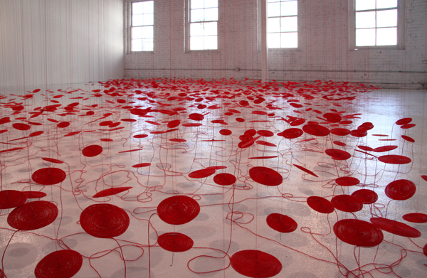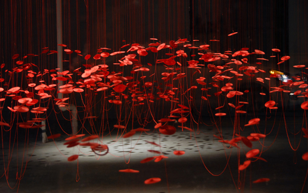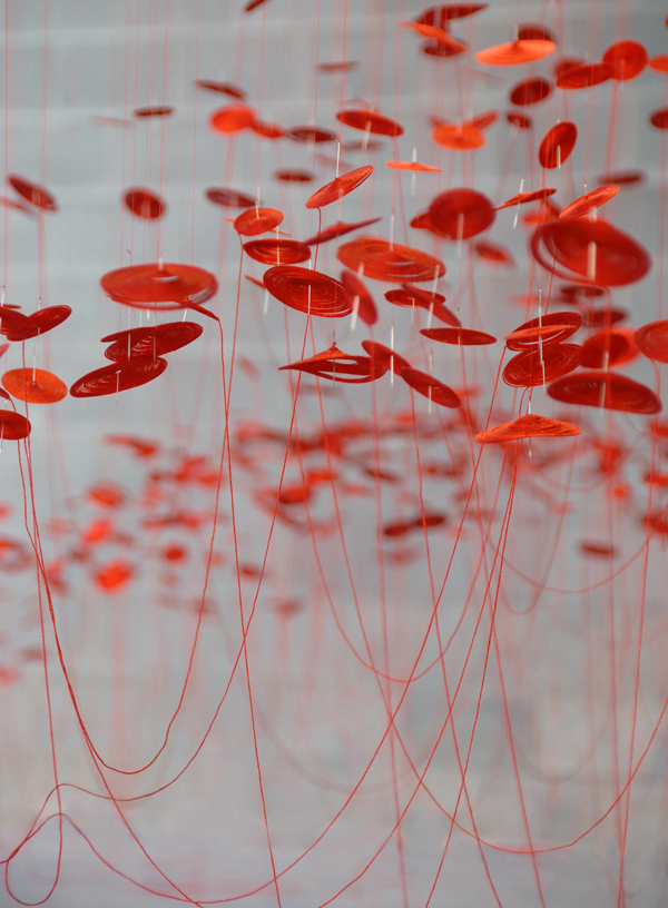 What appears to be a beautiful wafting sea of red discs is artist Beili Liu's visual interpretation of an ancient Chinese legend involving red thread. The belief behind the mythical tale of the “red string of fate” is similar to the western idea of soulmates. It suggests that, upon birth, every person is tied to another with an invisible red thread, signifying the individual they are destined to be with. The twine may stretch and bend, but it can never be broken to deter their fated encounter.