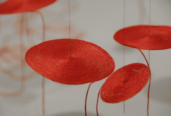 Liu's Lure series presents a massive site-specific installation piece featuring countless suspended, red coils of thread, each of which ranges from two to five inches in diameter. Each ring of tightly wound thread is connected to another one, somewhere in the space. The coupled pairs are made of the same piece of string so as to reflect the idea behind the legend. The discs are suspended by a centrally inserted sewing needle, compressed by the spiraling coils of thread, allowing them to sway and move somewhat freely in reaction to a breeze. Through this movement the connecting strings have the ability to become entwined with others, much like the relationships that serve as obstacles for the destined one.