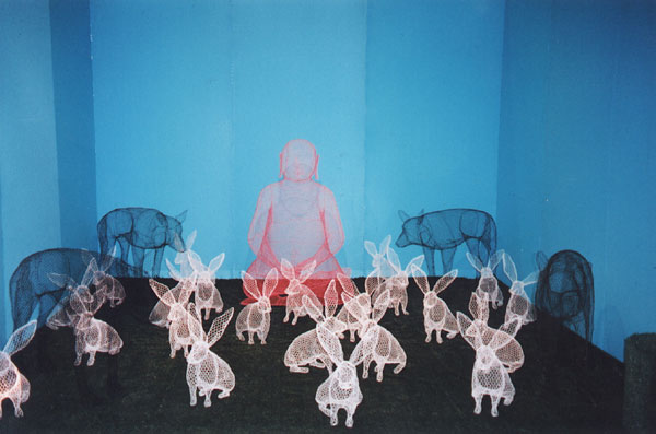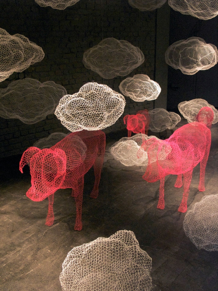 The transparent, overlapping figures form whimsical and unexpected scenes that you might see in a children's storybook. Ubaldini shapes the permeable material into giant rabbits, hot pink pigs, Little Red Riding Hood, and floating clouds that fill a gallery space. She experiments with colors and lighting to produce installations that, she says, “give a sense of wonder and magic,” and awaken the imagination in all of us.
