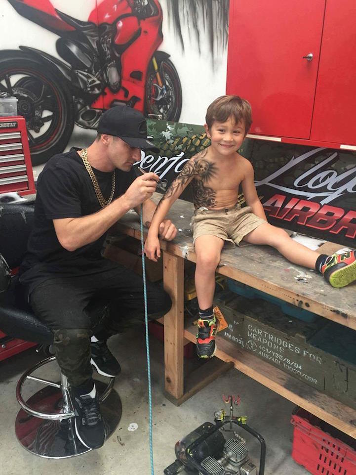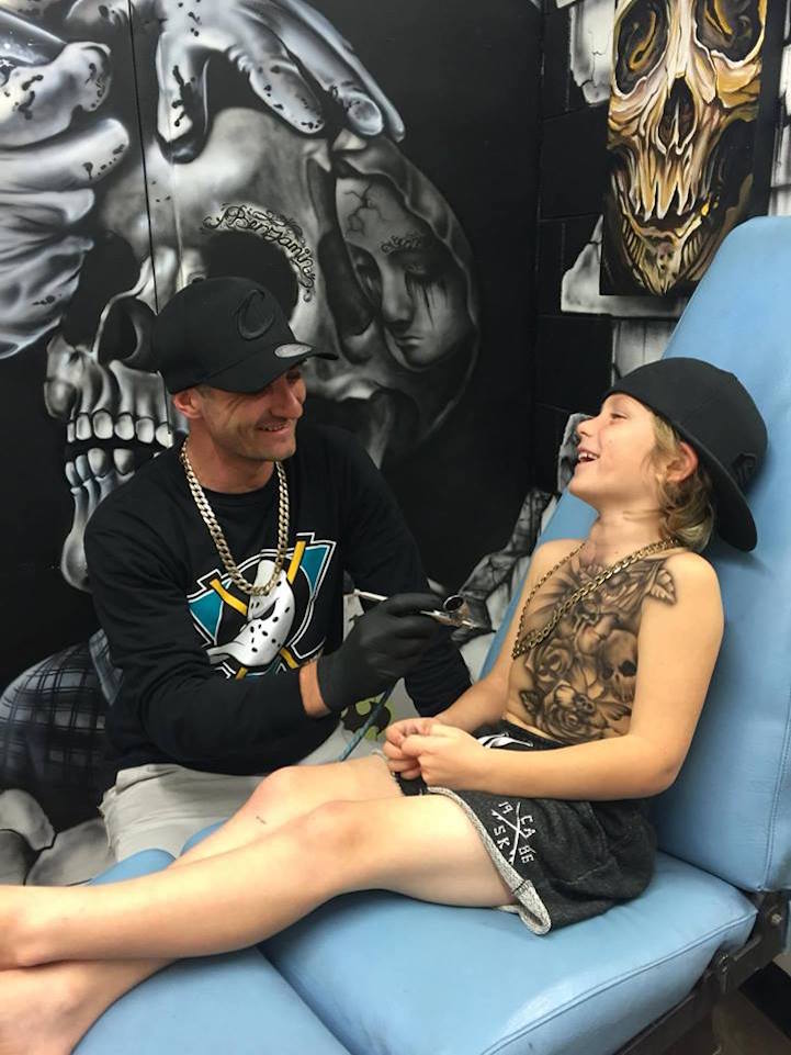 Lloyd has been an airbrush artist for 10 years and only recently started inking temporary tattoos. He began painting on adults and then on kids, who were elated by his handiwork. “It's just amazing watching their confidence and their ego boost up,” Lloyd told Mashable. “The only bad thing is that they don't want to take a shower afterwards.” Each piece is designed with the young client’s input and takes around nine minutes to complete. Lloyd uses traditional tattoo imagery like roses, skulls, and waves as they sprawl across the skin and look exactly like the real thing.