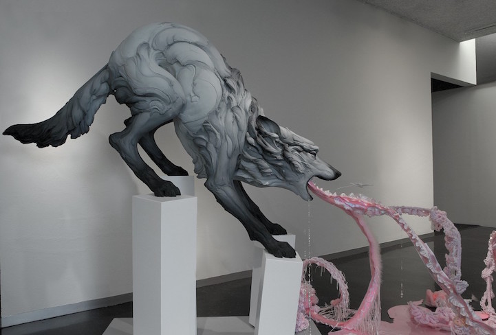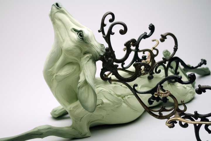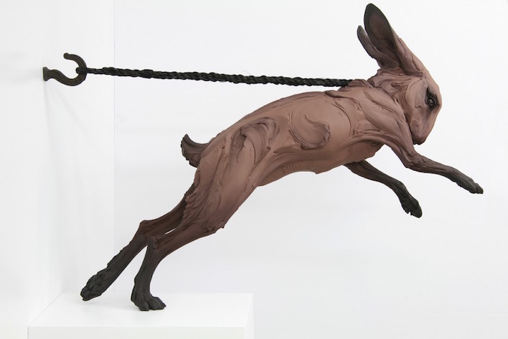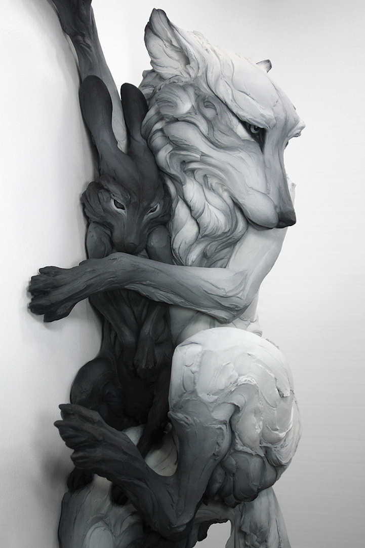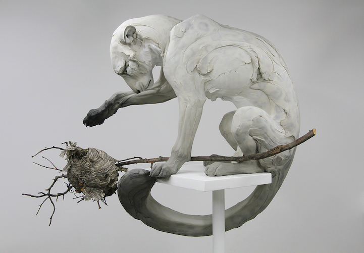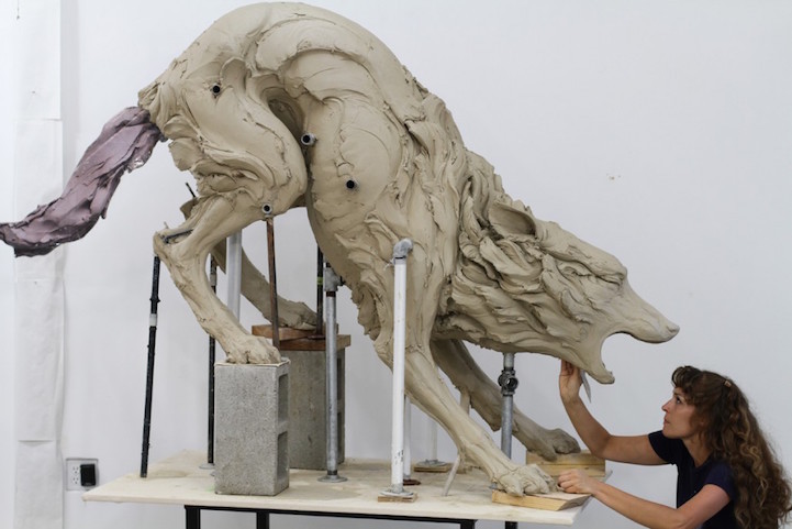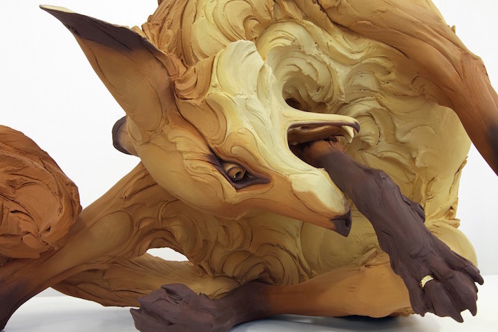 Montana-based artist Beth Cavener articulates intense human emotions and psychology through dynamic sculptures of animals. Using pipe joints, wooden dowels, and clay, she forms tense beasts that embody the consequences of fear, apathy, aggression, and misunderstanding. Although the body language is feral, the subtle nuances in the creatures' expressions, postures, and gestures transform each gestural piece into an expressive–and, at times, shocking–human psychological portrait.
