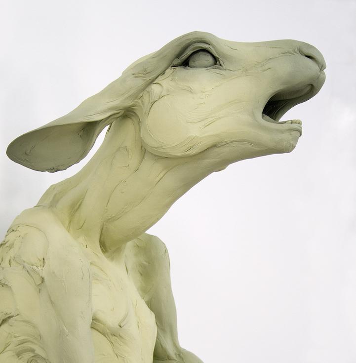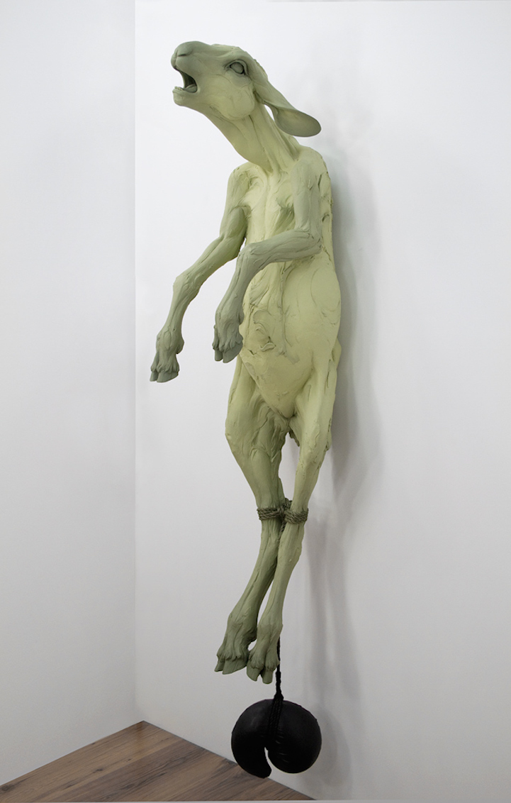 “I want to pry at those uncomfortable, awkward edges between animal and human,” the artist states. “Entangled in their own internal and external struggles, the figures express frustration for the human tendency towards cruelty and lack of understanding. Something conscious and knowing is captured in their gestures and expressions. An invitation and a rebuke.”