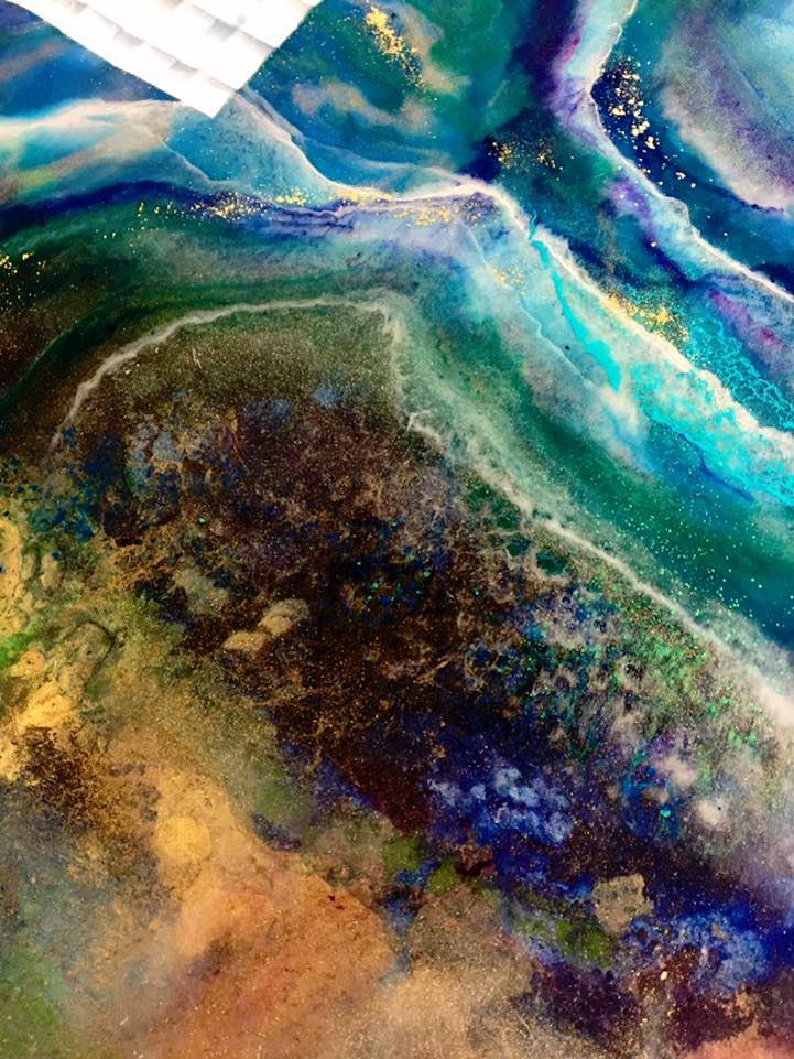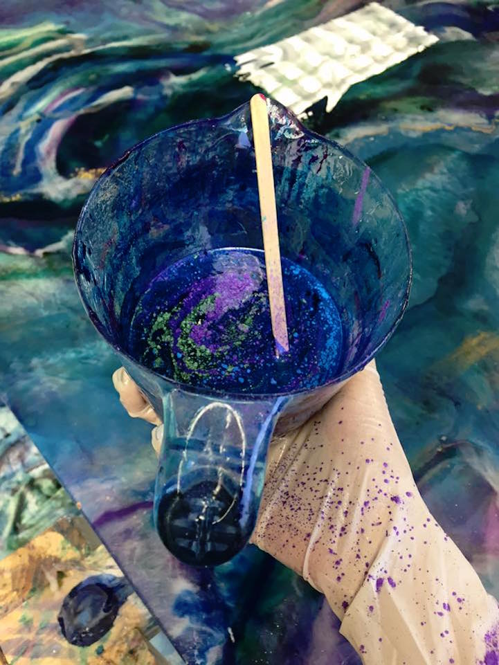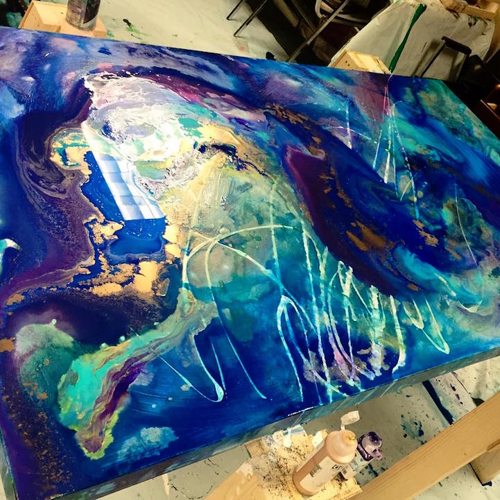The tones in the piece—deep blues, purples, greens, and aquamarines mixed with soft streaks of white and splatters of gold—seem to twist and ripple into one another, which Nguyen says comes from layers of experimentation and a loose, unplanned approach. While the acrylic affords color, it's the resin that gives the panel its shine, so it gleams like a surreal reinterpretation of a marble countertop.