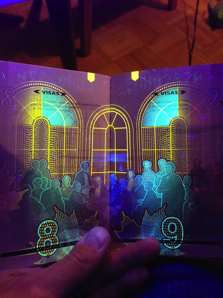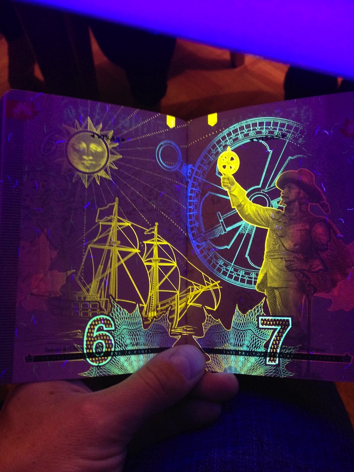 Canada began issuing these “electronic passports” in 2013. The new-and-improved documents offer upgraded security features similar to modern paper currency, such as imbedded watermarks and a microchip identity. The black light sensitivity feature is called “optically variable ink,” and its function is to change color based on the type of light it's exposed to. As one Reddit user accurately accessed, under black light, “It's like a party on every page.”