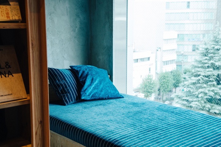 At first glance, the central area resembles a typical library or book store with shelves of books on one side, and couches and pillows to relax on the other, however on the shelves, between the rows of books there are also single-occupant sleeping compartments that are accessible via ladder. Guests sleep amongst the thousands of books that they are free to enjoy. The hostel also offers 18-bunk sleeping spaces, more similar to typical Japanese capsule accommodation if one requires a more spacious stay. Nightly rates range from 3,800-6,000 yen (US $32-$50).