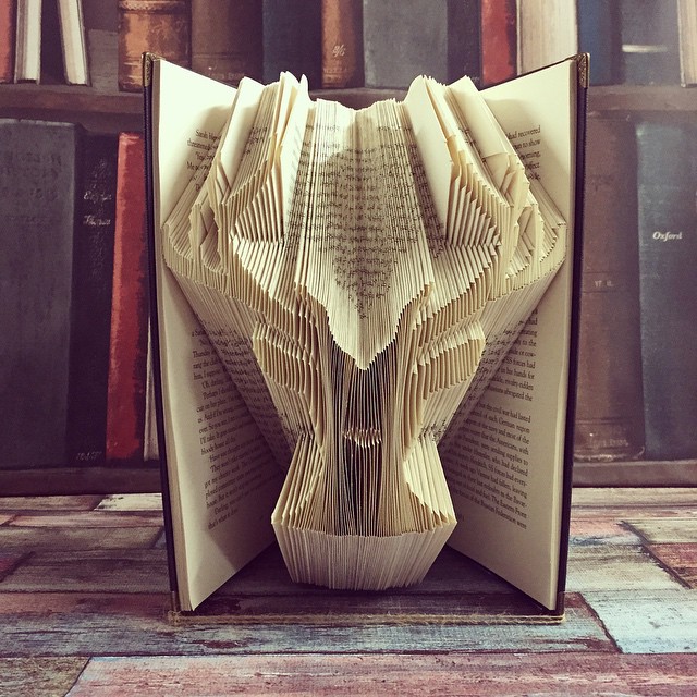 English artist Nicola Nobo transforms old books into intricate sculptures by meticulously folding their pages. Each sheet of paper is individually creased, and together, the hundreds of pages create three-dimensional designs between their hard covers. Nobo's excellent craftsmanship, with its even pleats and smooth outlines, makes her lettering, skulls, and animals instantly recognizable.