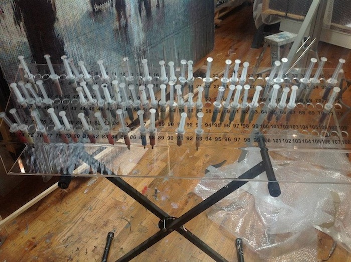 Using ordinary syringes, Hart injects each individual bubble with acrylic paint. The process is not only time consuming, it's incredibly complex. While his finished pieces are unbelievably impressive, one can't truly appreciate his works unless one can visualize the process. Below, see behind-the-scenes pictures that show his boxes of syringes, his make-shift artist palette, or one of his paintings in progress.
