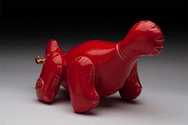 West Virginia-based artist Brett Kern has mastered the art of illusion with handcrafted ceramic sculptures that deceptively look like inflatable toys. Each figure in this ongoing series of work presents a set of whimsically simple characters, be it a minimalist dinosaur or a cartoonish astronaut. With additional details including its shiny glaze, a cleverly placed air valve, and the painted illusion of seams, pinched from the pressure of air inside, Kern manages to easily trick viewers into believing his ceramic works are merely balloons.