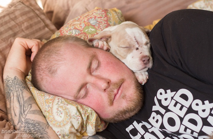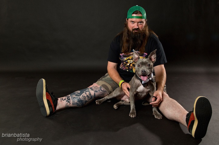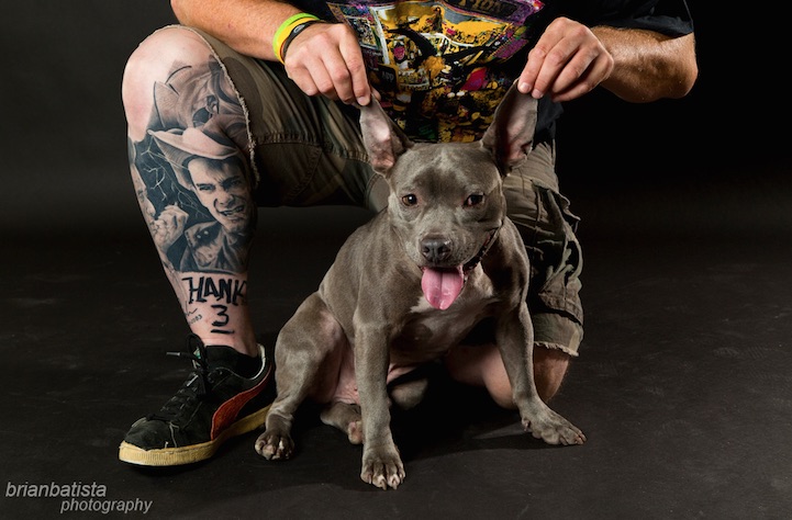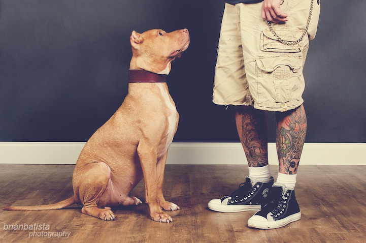 To combat the prejudices felt against both tattooed people and rescue dogs, photographer Brian Batista started a heartwarming project. He would photograph them together. Tattoos and Rescues began back in September 2012 in Birmingham, Alabama and it shows photos of rescue dogs with their loving owners. Pit bulls, with their bad reputation, are the ones often featured in this series. In the photo above, owner Richard Burgess stands paws to hands with his rescue puppy Major. The small pit bull has a scar running down his face from an attack by another dog where he was badly injured. His owner says he's now very happy. In the picture you'll notice that Richard has stamped his knuckles with the words “Save Them” to show the never-ending plight of rescues.