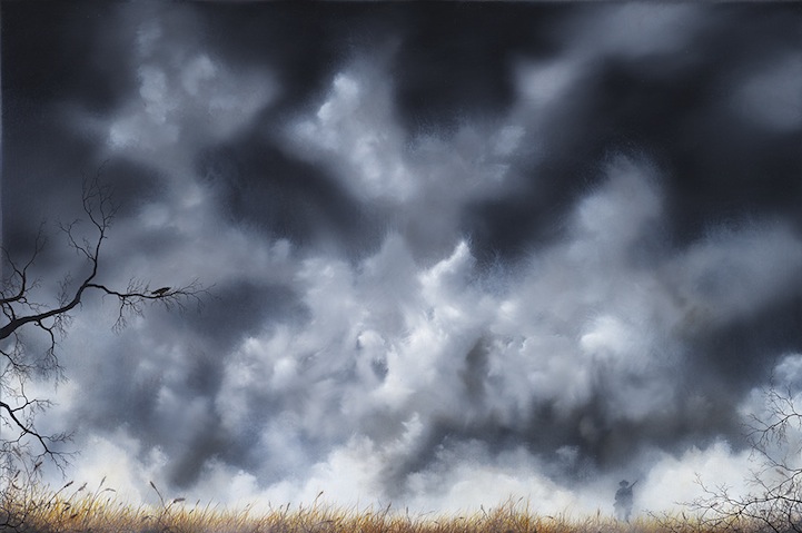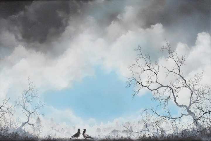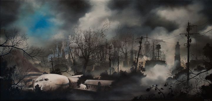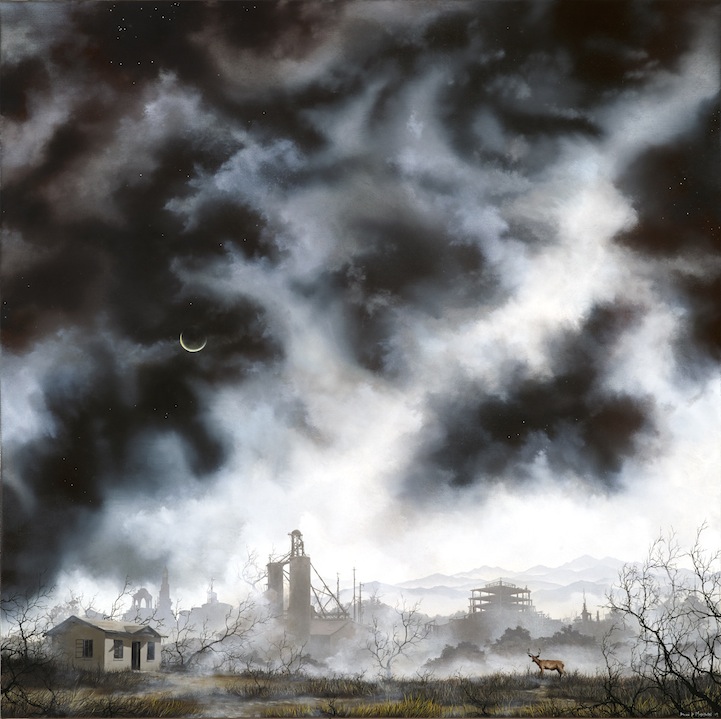 Artist Brian Mashburn's exquisite oil paintings of broken cities and decaying lands are as beautiful as they are haunting. Mashburn illustrates tangled, leafless branches against a smoldering landscape and heavy sky. Sometimes, we see an animal or person trying to make sense of what's around them. It seems bleak, but the artist does offers a glimmer of hope, and we see patches of blue sky and white clouds among the sepia tones, blacks, and grays.