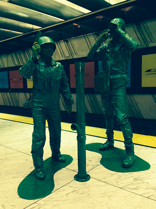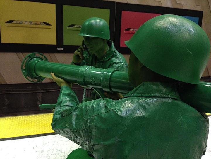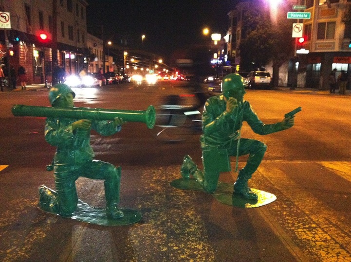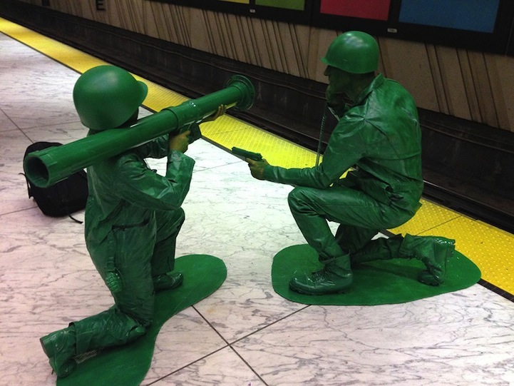 Halloween is a time for people to get especially creative and this year, Redditor BritishRacingGreen and his girlfriend have gone all out, transforming themselves into life-size plastic green army men. The San Francisco-based duo roamed the city streets in their elaborate getup, stopping for countless photo ops as they each took their position with their carefully crafted props–one with a makeshift telephone box and toy pistol, the other carrying a “bazooka.”