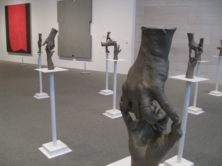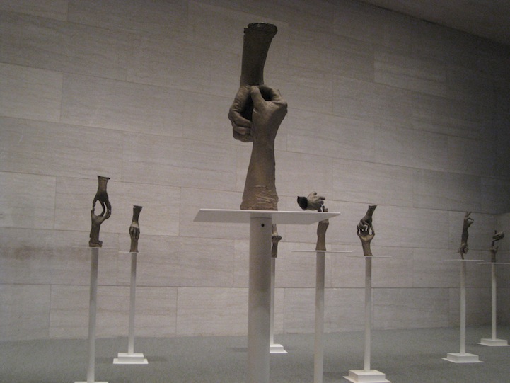 Fifteen Pairs of Hands is a sculptural installation by artist Bruce Nauman featuring 15 white bronze sculptures of dismembered hands frozen in various positions. Each piece is presented atop its own steel base coated in white paint as a set of disembodied hands interacting with one another. Nauman's fascination with hands and the various forms they can take on is evident through the installation as each pair performs unique gestures.