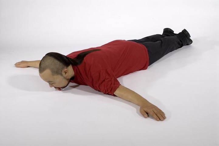Nearly a decade since the performance project's inception, Xin created a replica of himself, face down and tongue out. The unbelievably life-like sculptural installation depicts the shaman in a pose he has grown all too familiar with on his quest to promoting “harmonious communication with nature.”