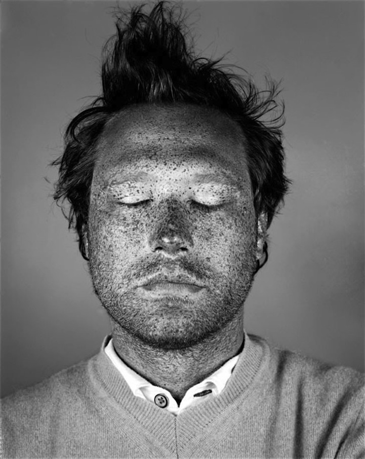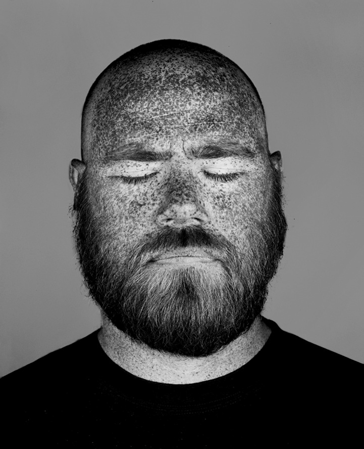 Inspired by medical photos from doctors' offices and medi-spa websites, Phillips invited her subjects to keep their eyes closed to create a sense of tension between what could be either a revealing or a restricting photograph. The subjects, with their eyes closed, become a vulnerable object and, as viewers, we become voyeurs who are peering in to a seemingly calm and intimate moment. It feels almost acceptable to critically examine every little pore and freckle and speck on each face without fearing the consequences of getting caught staring.