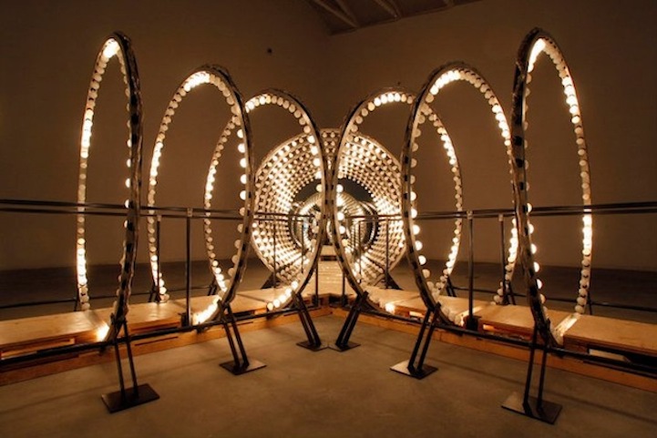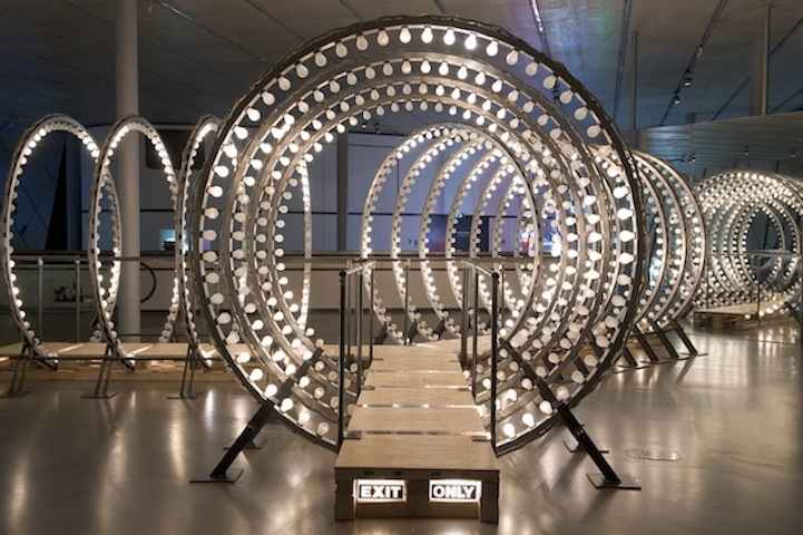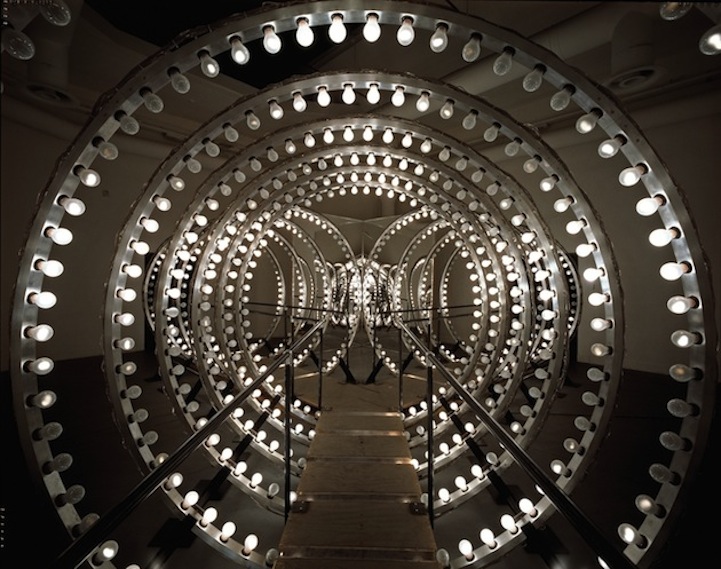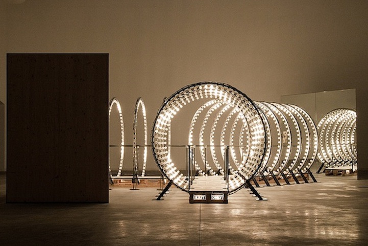 A spiral of 960 light bulbs lead you through this Y-shaped installation by Carsten Hller. The Sweden-based artist designed this installation, appropriately entitled Y, out of aluminum, wood, cables, and mirrors, to form a continuous daze of flashing, bulb-filled circles that branch out into two pathways. As visitors travel through the installation, they become engulfed in a sea of illumination.