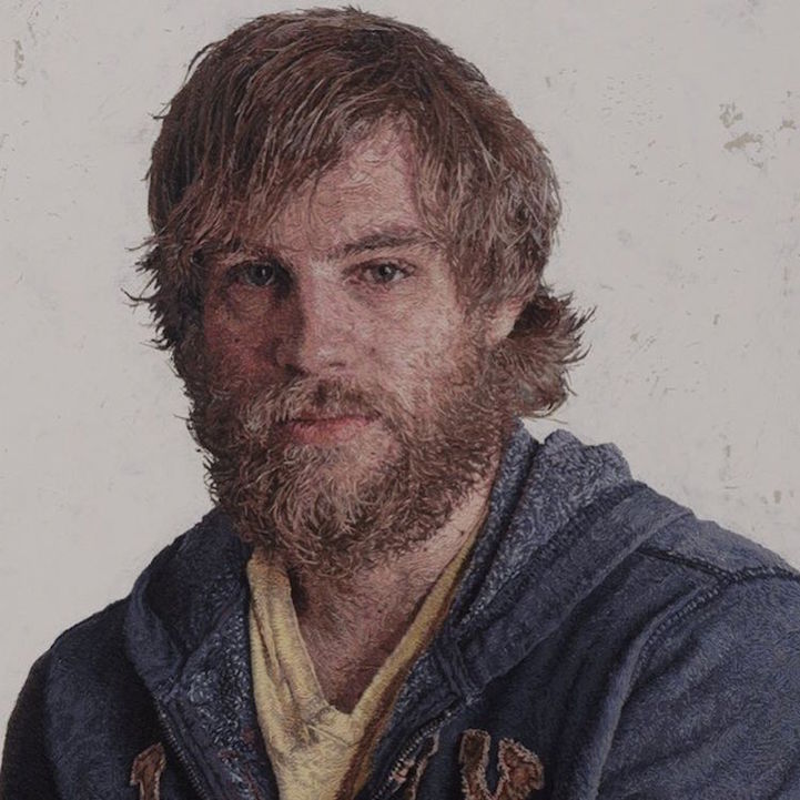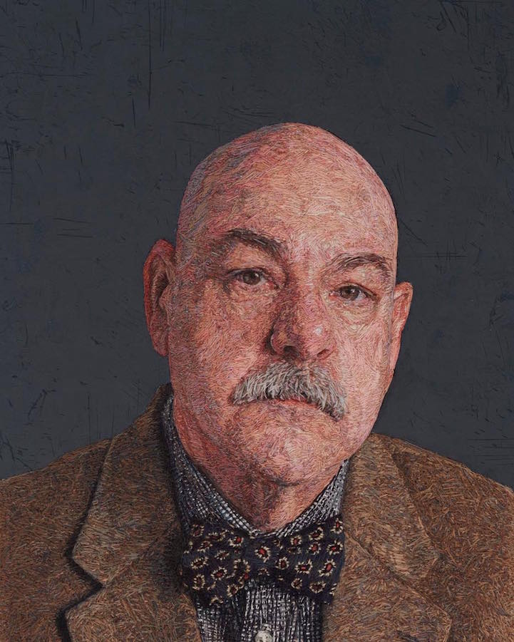 Zavaglia's artistic training is apparent in her intricate crosshatching, her blend of colors and tones creating a depth and richness to each piece. Using friends and family as subject matter, each image commutes an organic beauty through the natural expressions of those depicted. With her newest exhibition, the Missouri-based artist aims to highlight “the reverse side of [her] embroideries, which historically and traditionally have been hidden from the viewer,” in order to initiate a conversation about “the divergence between our presented and private selves.” The contrast between the hyperrealistic front images, with the chaotic and loosely abstract knots of the reverse provides a haunting comparison and facilitates a dialogue.