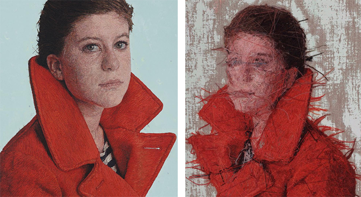 Zavaglia's portraits have always been an impressive display of skill, with a natural beauty that shines through the detailed thread work, but her newest collection showcases an artistic growth as she uses her talent to explore a deeper narrative. Selected works will be on display in an exhibit, titled About Face, at Lyons Wier Gallery in New York from November 5th to December 6, 2015.