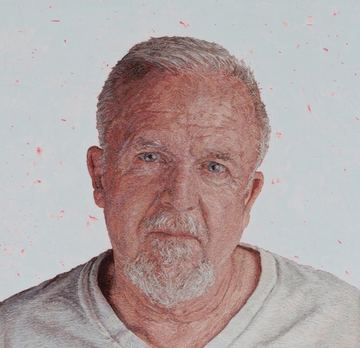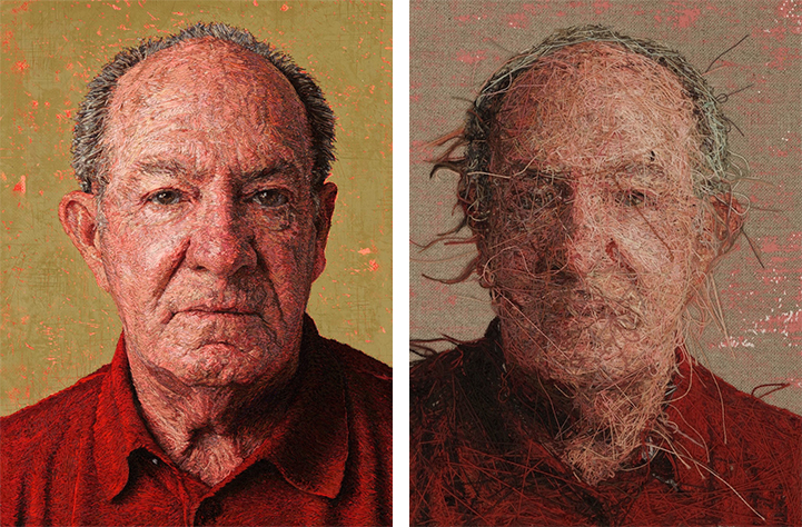Cayce Zavaglia‘s portraits capture her subject's natural beauty through textured layers of hand stitched embroidery, emulating the brushwork of classical oil paintings. Trained as a painter, Zavaglia made the switch to embroidery as her primary medium over 14 years ago. Her latest work finds her returning to her roots, combining paint and embroidery to explore the hidden and abstract. She represents this visual duality by placing paintings depicting the haphazard, reverse side of her embroidered creations beside each hand-embroidered portrait.