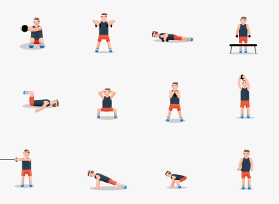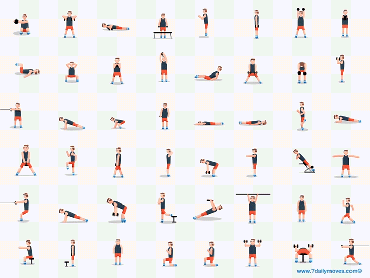 The GIF features activities that you can complete with or without gym equipment, and they all work different parts of your body. Some concentrate on your abs while others strengthen your arms and legs. A kettle bell and free weights are required for several of these exercises, but a few have you laying on the floor. The same adorable figure, clad in a funky headband and striped socks, leads the charge for a healthier you.