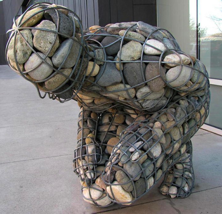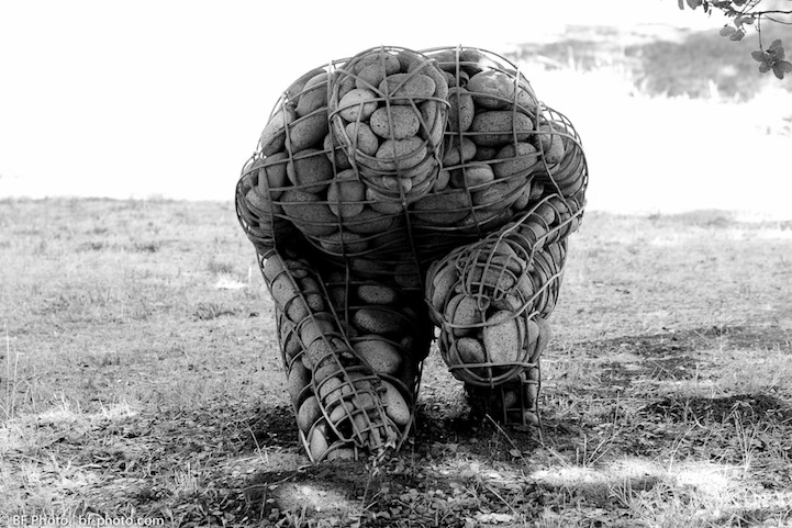 Rising Cairns is a commanding sculpture where Roberge welded a steel grid into a rough likeliness of her own body, but much larger than real life, measuring 58″ x 54″ x 43″. Using raw materials from the surrounding land, Roberge filled the unique steel framework with 4,000 pounds of granite. There is a strong juxtaposition between the organized grid shell and the jumble of all shapes, sizes, and textures of rocks held within. Rocks that have existed for possibly millions of years are contained within the equally enduring steel frame, yet stand as representation of the fleeting and mortal human life. According to one review, “The cairns are, in the aggregate, massive and weighty, and seemingly unchanging, at least within our human time frame. Yet, with irony or humor, they help define a human form.”
