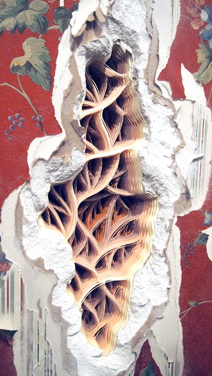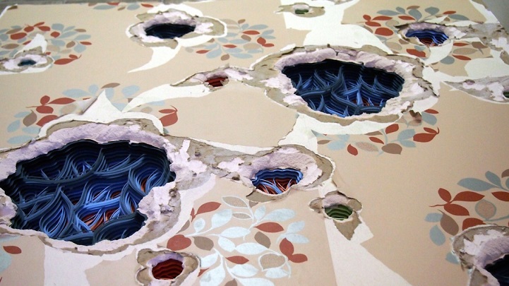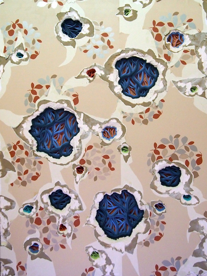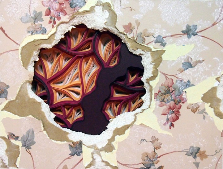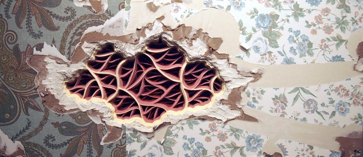 His series featuring paper constructions tucked underneath coats of wallpaper are made to resemble computer generated sound waves or petri dish samples of viral colonies. With a sense of layers being peeled back from the surface of an alien body, Clary's meticulously arranged works contrast beautifully with the disintegrating exteriors. Clary has stated that his art serves to “explore the constant ‘growth' of [the] installations, which, if left alone to gestate, will eventually take over entire spaces, infesting every surface they touch.” By balancing these themes with brighter colours, Clary's work remains playful and intriguing.
