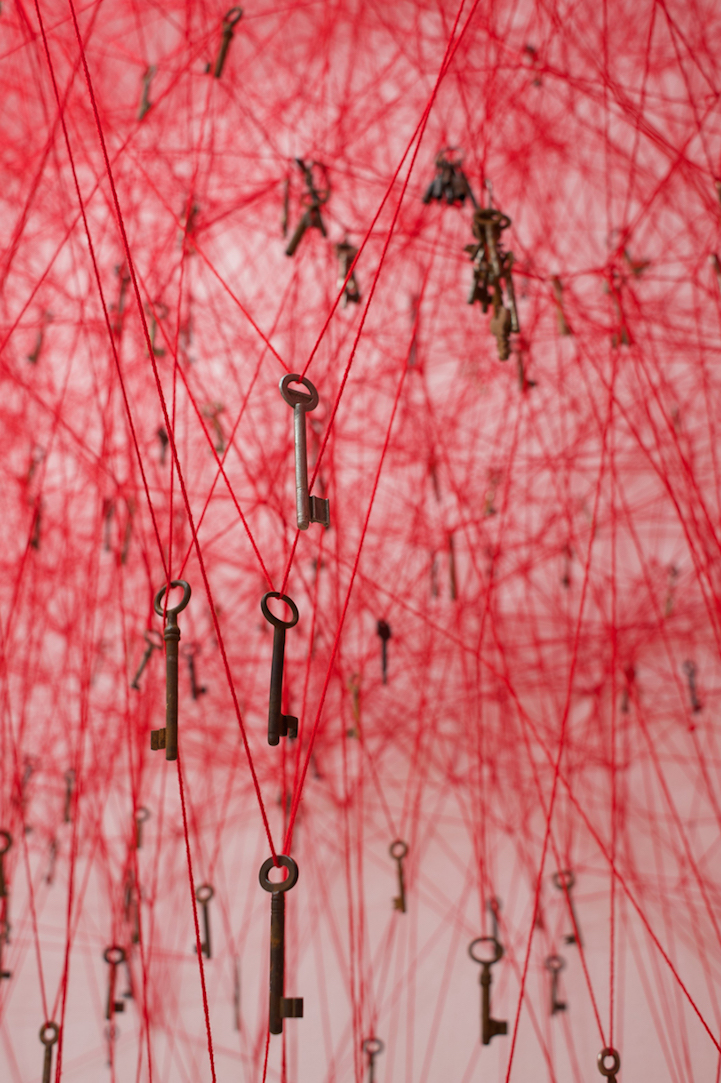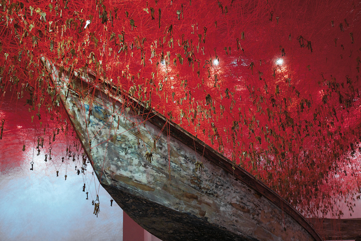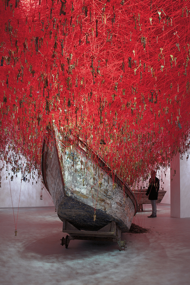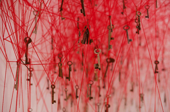 Within the 2015 Venice Art Biennale's Japan Pavilion, artist Chiharu Shiota has amazed visitors with an extraordinarily immersive presentation. Using two boats, vibrant red yarn, a net of interlaced metal, and more than 50,000 unique used keys, Shiota created “The Key in the Hand,” an exhibition meant to inspire viewers to think about the importance of memories and the unknown. The display features the intertwined keys hanging over the boats on bright red yarn and onlookers are able to walk beneath the maze on a winding path.