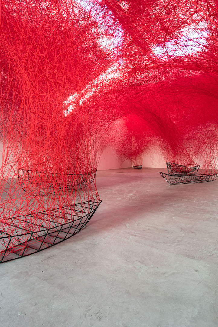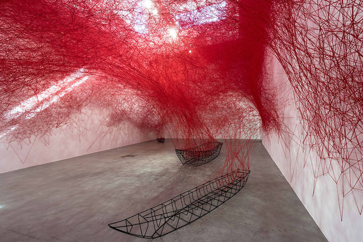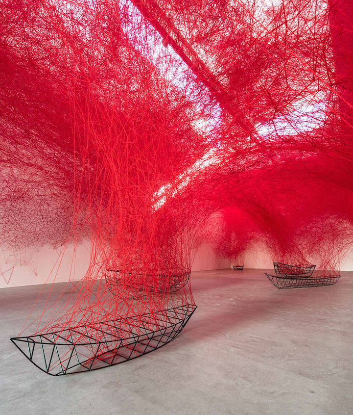 Artist Chiharu Shiota is known for her intricate, immersive installations that are meditations on the human brain and memory. Last year, she illustrated this idea by collecting 50,000 keys and stringing them along thread that engulfed the ceiling of a gallery. In a similarly awe-inspiring fashion, Shiota has created Uncertain Journey, a site-specific exhibition in which a dense web of scarlet-colored yarn swarms above stranded skeletal boats.