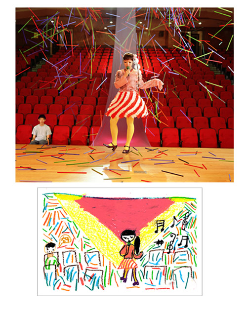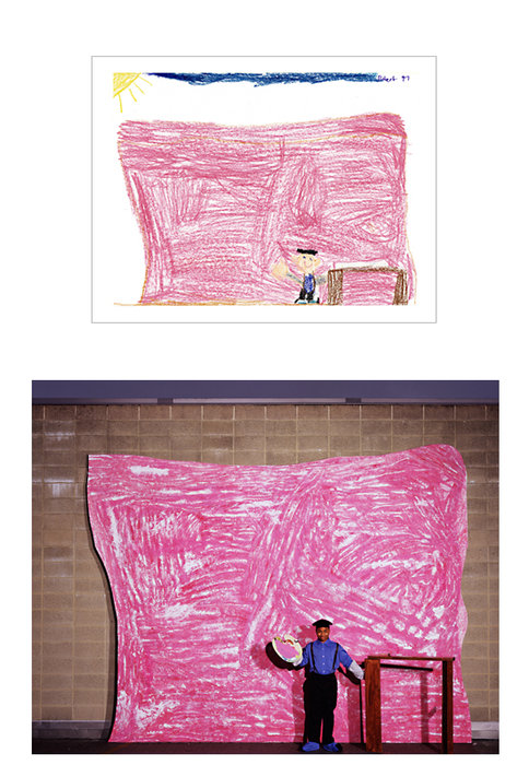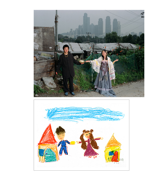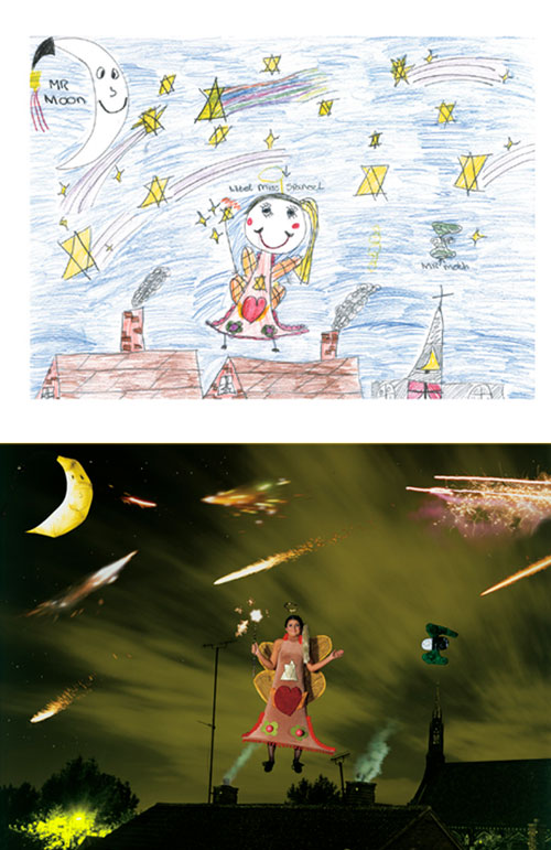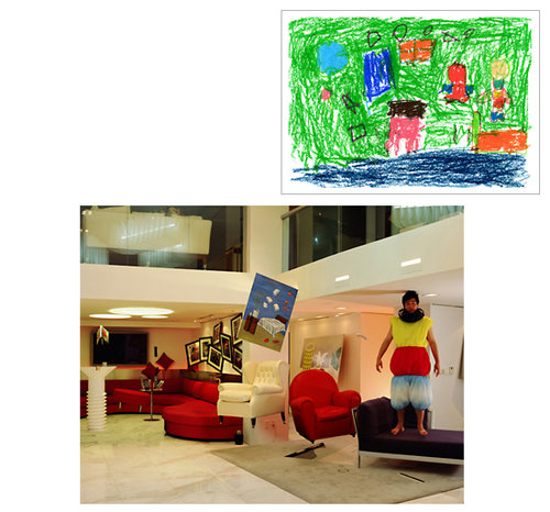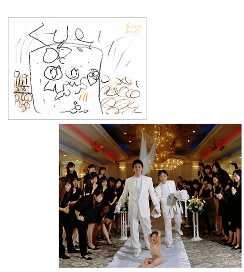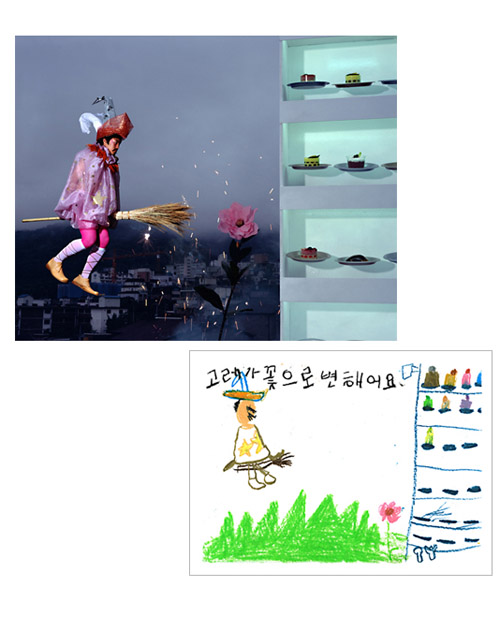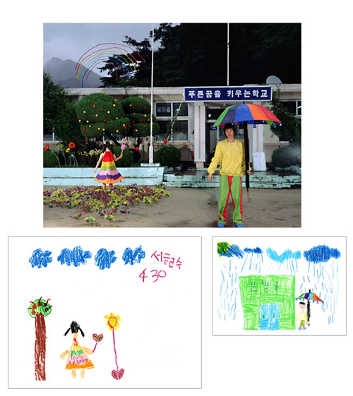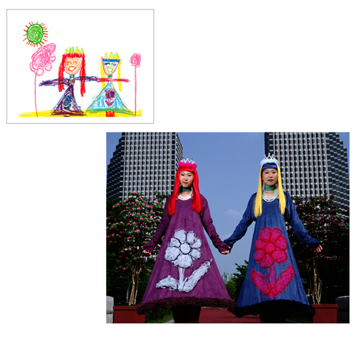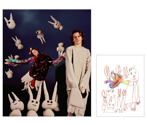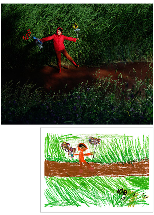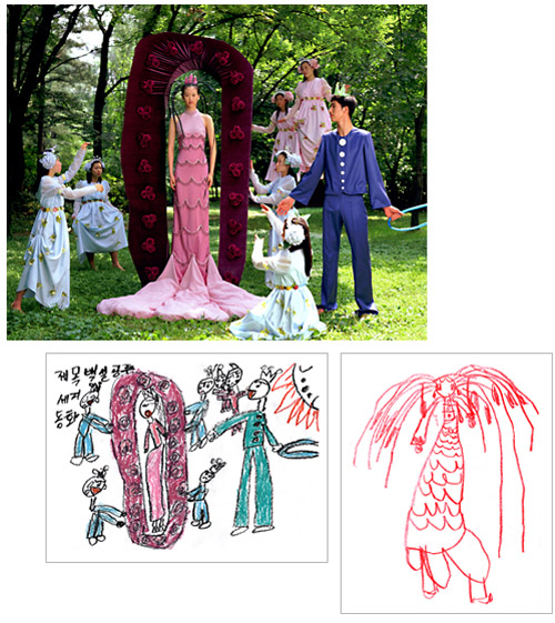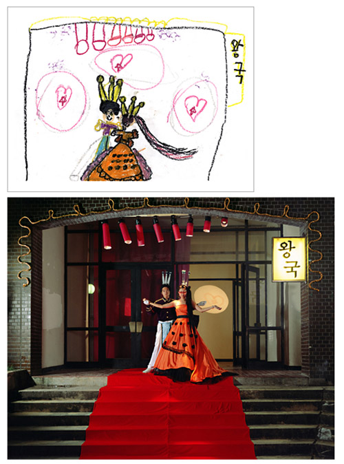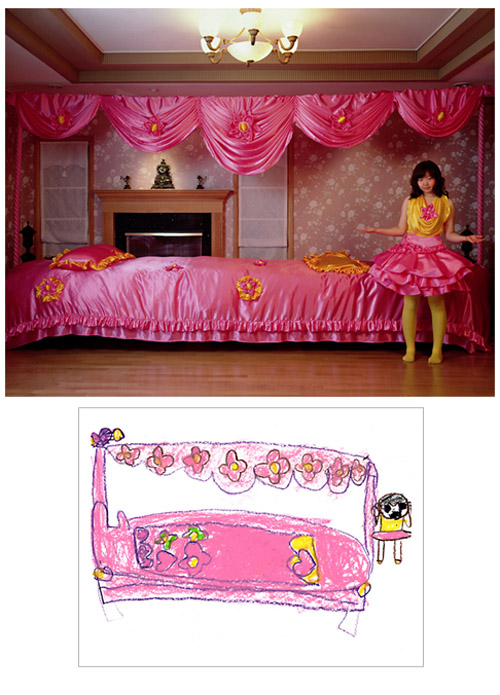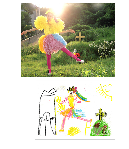 How much fun would it be if you could make childhood drawings come to life? That's what Korean artist Yeondoo Jung did with his creative Wonderland series. Jung transformed crayon drawings filled with sweet and sometimes bizarre imagery into real life photographs. Without the help of any computer graphics, Wonderland takes us from fantasy to reality in one fell swoop. For four months, Jung oversaw art classes in four kindergartens in Seoul and collected 1,200 drawings by children between the ages of five and seven. After pouring through them, he carefully selected 17 drawings and interpreted their meanings. Then he recruited 60 high school students by passing out handbills at their schools in which he invited them to act out the scenarios in the children's drawings. In order to recreate faithfully drawing details such as dresses with uneven sleeves or buttons of different sizes, he convinced five fashion designers to custom make the clothing for the photo shoot. He also made props unlike any scale found in reality but similar to those in the drawings.