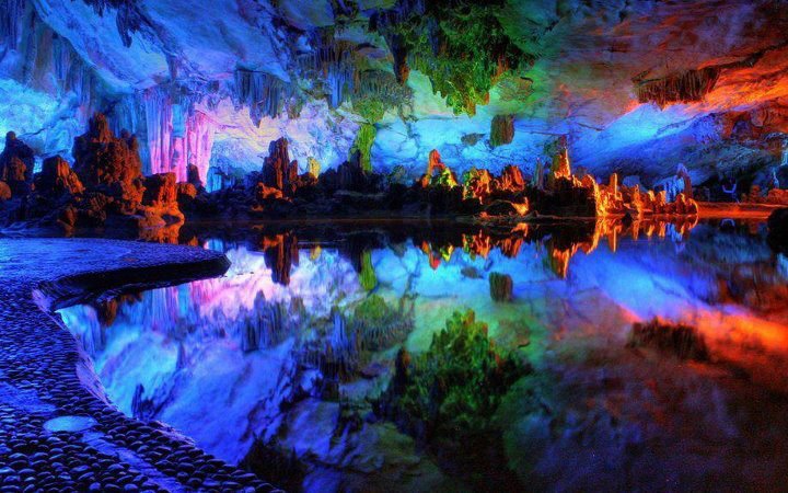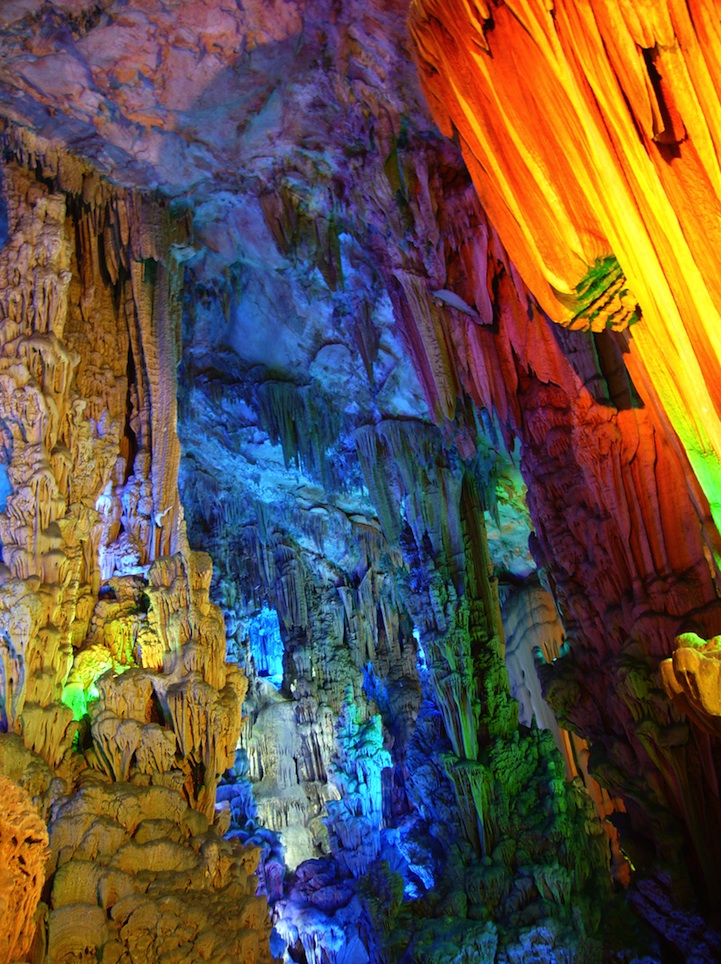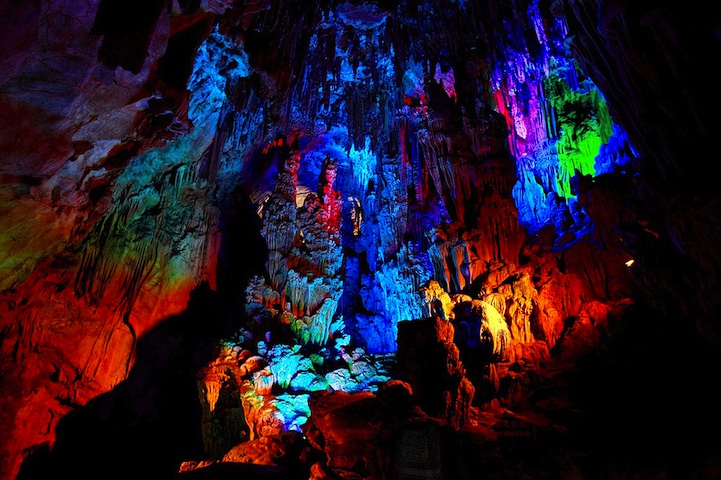 Rising from the floor and descending down from the ceiling of this great big limestone cave are stalagmites and stalactites that are lit up in a dazzling array of colors. The Reed Flute Cave in Guilin, Guangxi, China is a major landmark and tourist attraction that's often referred to as the “Palace of Natural Arts.” The natural rock formations, illuminated with artificial light, make it one of the most extraordinary underground scenes in all of China.