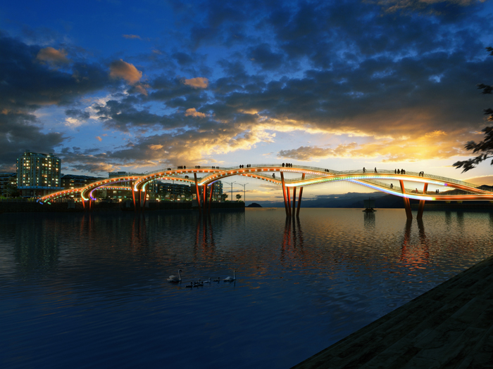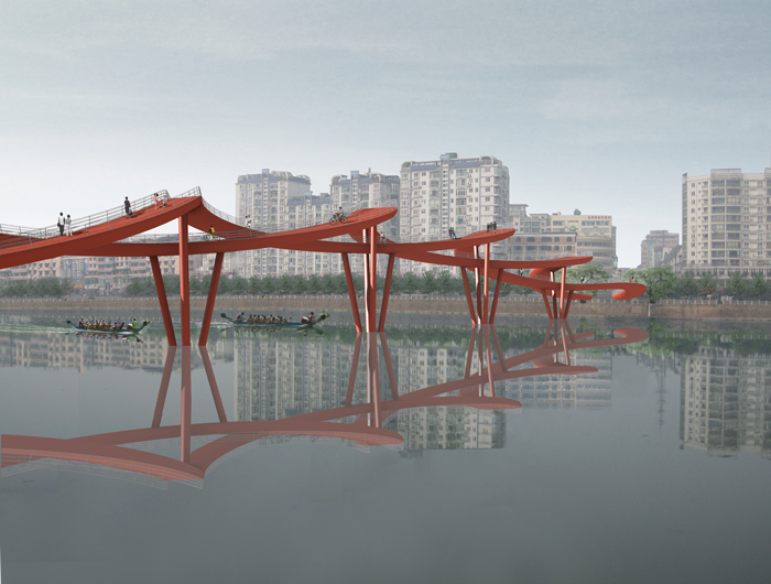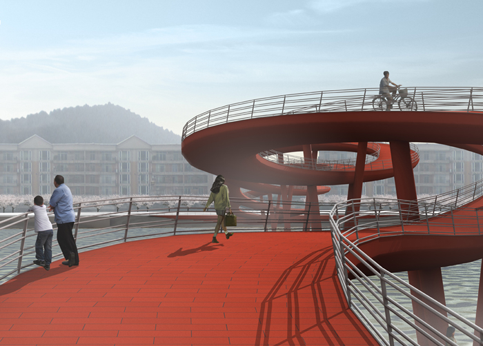 The helical bridge is held up by five multi-limbed supports, increasing the current spacing for watercraft and other recreational uses of the river. The two intertwined ribbons also serve a practical purpose by greatly expanding the capacity of the bridge to allow it to keep pace with Xinjin's future growth.