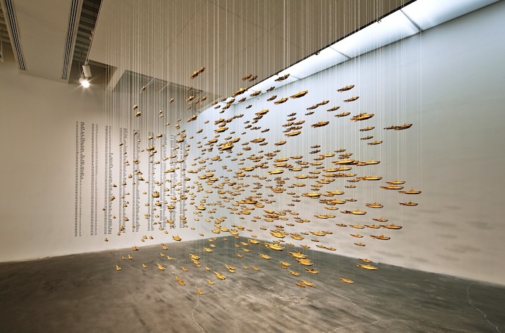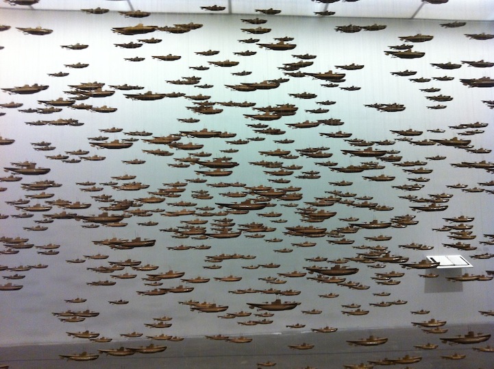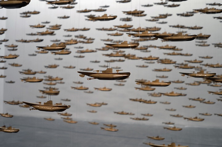 For the first time in 25 years, performance, sculpture, and installation artist Chris Burden is presenting a collection of his work, entitled Extreme Measures, in the United States. As part of the exhibition at the New Museum in New York, Burden installed All the Submarines of the United States of America, filling a room with 625 hand-painted cardboard submarines that are suspended from the ceiling at varying lengths.