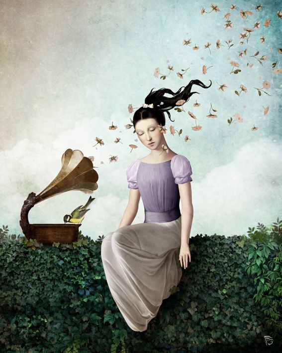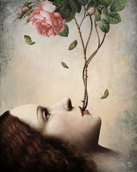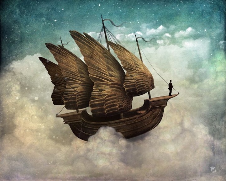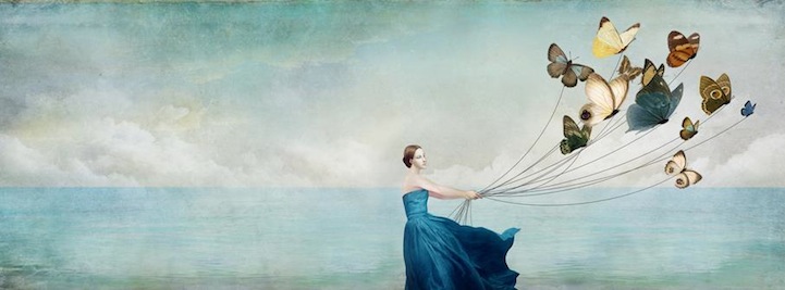 These surreal scenes by Christian Schloe feature bizarre moments that draw viewers out of a concrete reality and into a dreamy, fictional world. In his work, the digital artist creates expressive visual stories filled with soft color palettes, elegant birds and butterflies, soft flower petals, and otherworldly, majestic landscapes. The illusion of a scratched canvas and worn, aged edges allude to a different time and place where a howling wolf is half human, half animal; a couple dances among the clouds; and a young girl collects drops of moonlight in a bowl.