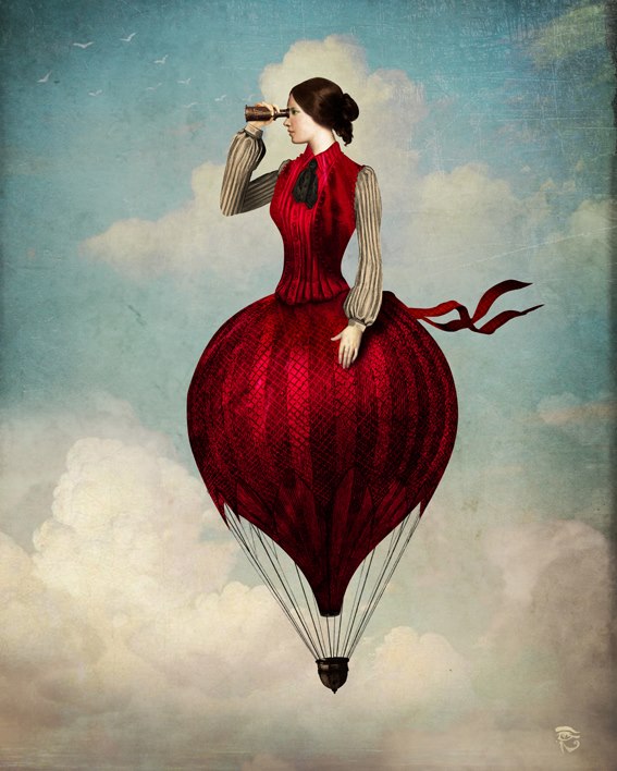 Each beautifully designed composition is a whimsical fantasy concocted by the talented artist. Schloe playfully blends realistic elements with perplexing, conceptual ideas. In doing so, he creates the illusion of serenity within a strange and confusing composition. Though he may have significant meaning behind his work, the artist leaves no clues to an explanation. Viewers are left to venture out on our own journey, interpreting the intriguing illustrations with endless possibilities to the narratives that we might dream up.