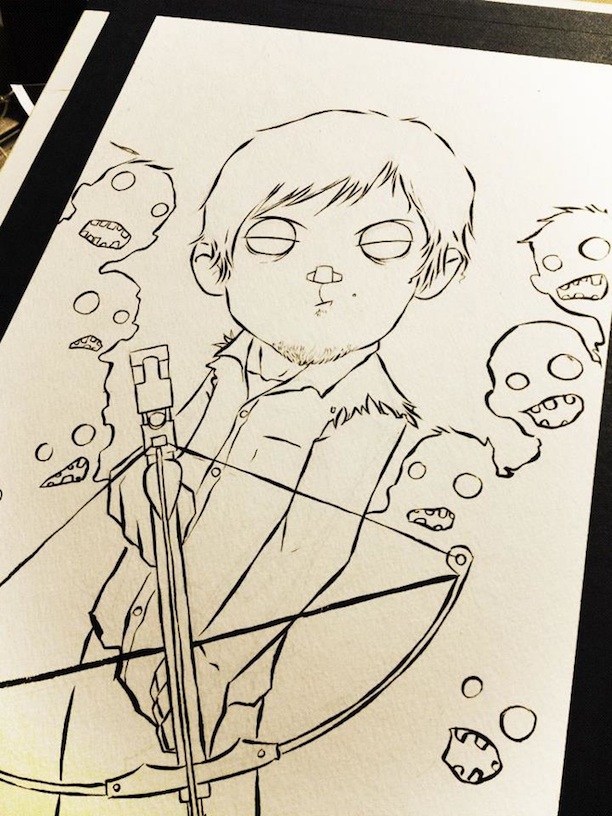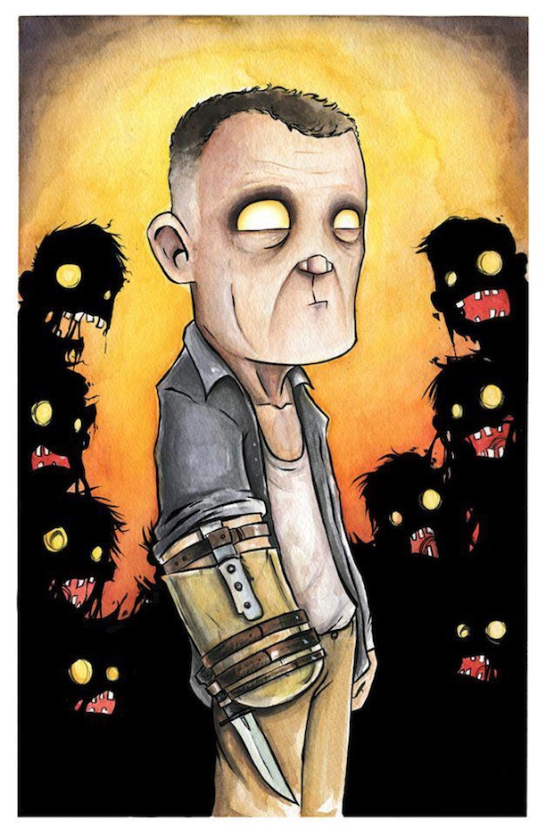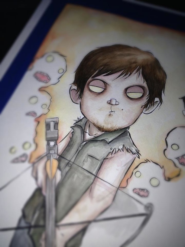 Fan of the hit AMC show The Walking Dead? If so, you'll love these new watercolor paintings by artist Christopher Uminga. Almost more impressive than the final product is seeing each piece come together. For resident badass Daryl Dixon, notice how the artist first starts off by drawing with ink and then slowly adds in the details with watercolors. Of course, the zombies are the real stars of the show and these prints though. Love how they're all ominous dark figures in the background.
