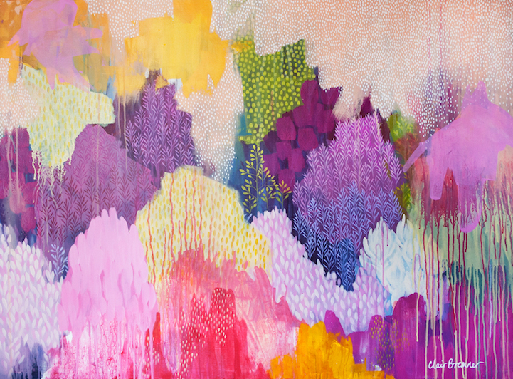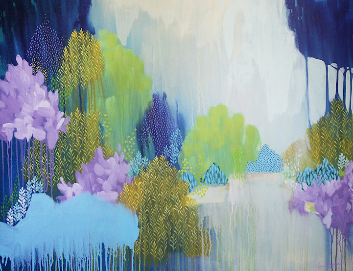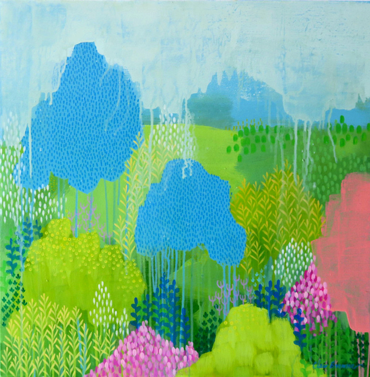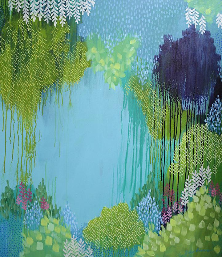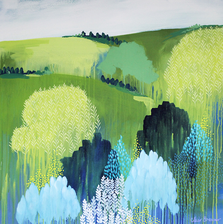 Bremner wields her brush with both loose intuition and delicate intention. She renders bushy billows of treetops in thick, knobbly strokes, but intricately flecked with the tiny blades of leaves or layered with wispy fronds. These precise patterns meet languid drips and erratic splashes that melt down each canvas where trunks or stems might otherwise be found. Her color palette, meanwhile, varies from one piece to the next, seeming to capture the moods of different hours and seasons despite the often surreal and even technicolor tones. She explains, “I generally work with analogous colours combinations because I feel they best reflect the natural harmony of nature, the subtle warm or cool changes of the seasons and foliage provide endless inspiration. However, I am not afraid of colour and I often experiment with combinations that are not usually traditionally associated with nature and landscapes.”