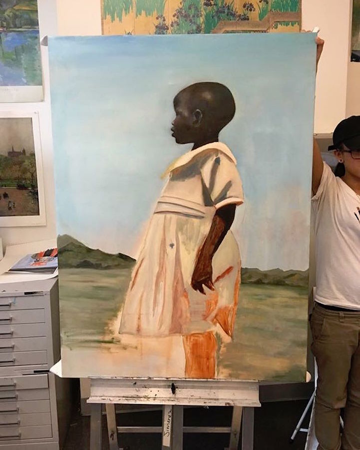 Forrester’s composition is based on a memory from a missionary trip to Uganda in 2014. As she told ELLE.com, “We were going to church and I saw a little girl who was just standing around, admiring everything.” She took a quick photo of the anonymous stranger, who became the subject of the now legendary painting, thanks to encouragement from her teacher, Ms. Jimenez. Jimenez also suggested that Forrester study painters like Edgar Degas and Diego Velázquez for stylistic inspiration.