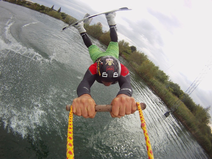 Wakeboarding with GoPro fan Christian Schranz, who says “Air railey at Cableways in Dresden (Leuben Lake).”