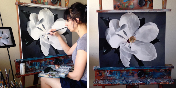 Delicate and vibrant shading work imbues Berindei’s colorful drawings and paintings with a realistic quality that speaks volumes to her artistic abilities. As the nature and material of her work varies over time, Berindei continuously proves that she is equally talented, no matter the subject matter. Landscape drawings of powerful cresting waves are just as well done as the fine veins snaking through the petals of her flower paintings, as are the piercing eyes staring out from her dynamic human portrayals.