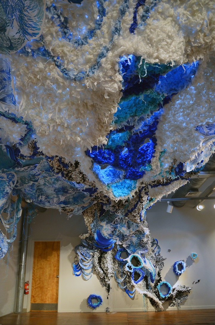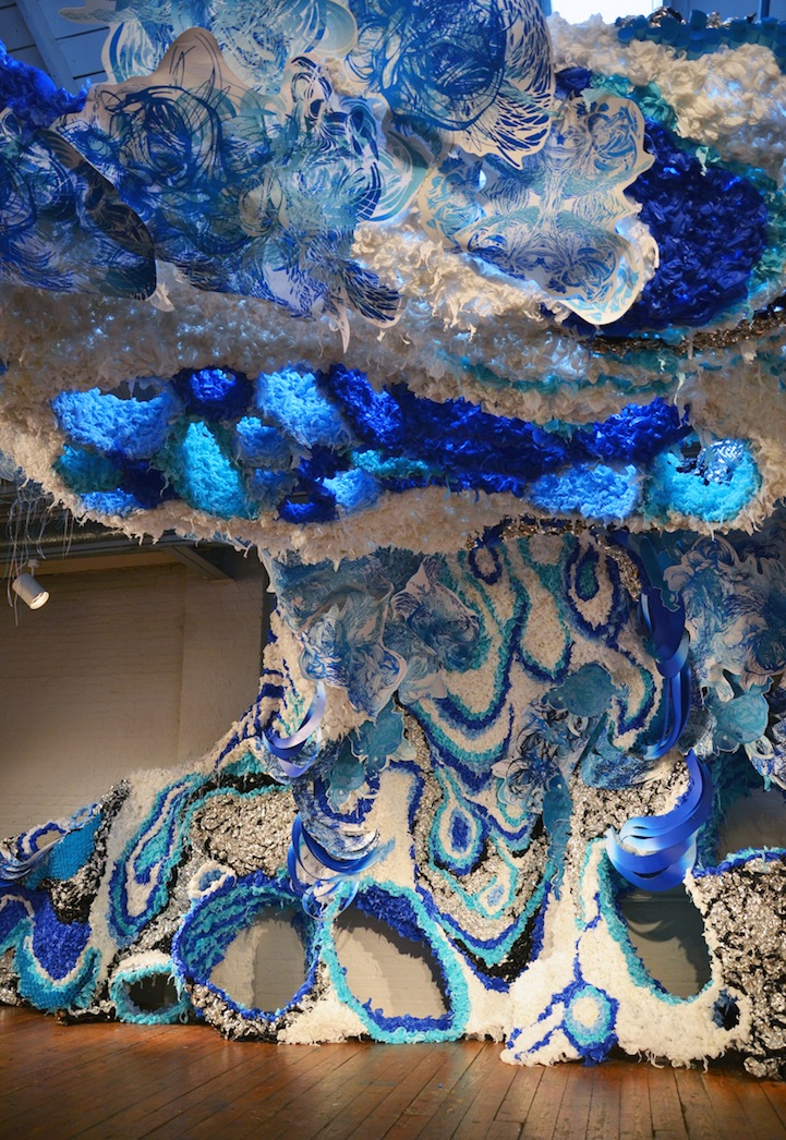 Deluge is an installation mimicking a giant tidal wave by Atlanta-based artist Crystal Wagner that is made of plastic table cloth, balloon mylar, screen print and chicken wire. The site-specific piece creatively engulfs its space like an unrelenting surge of water, simulating the motion and brilliant ripples of the blue water and its salty, white foam. Like an abstract spirit or monster, it imposes itself unto the gallery space, allowing the viewer to take in its enormity.