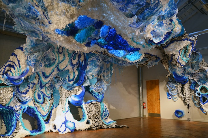 Wagner describes the piece as “a torrent of plastic that rushes through the architecture of our manmade space. It is a tidal wave of uncertainty and a reminder of our smallness and our lack of control over the natural world.” She tells us, “I wanted to use the skylight in a way that amplified the relevancy of natural sunlight and let the form grow, uncontrollably through the gallery.”