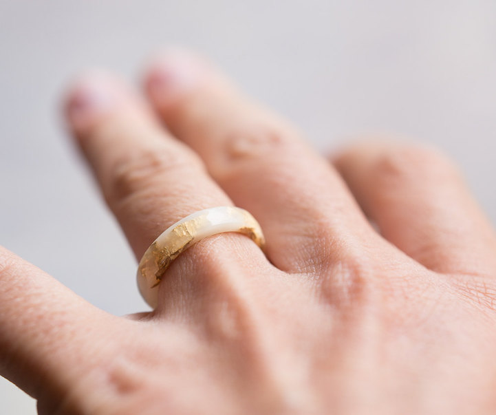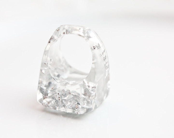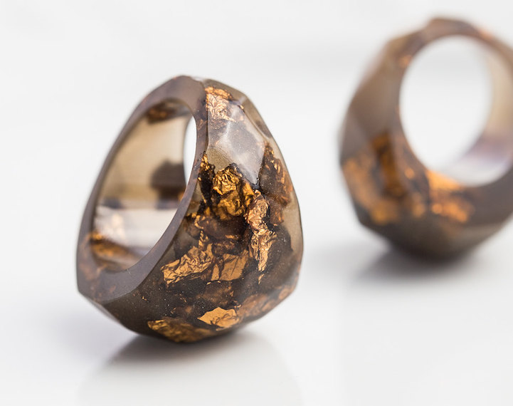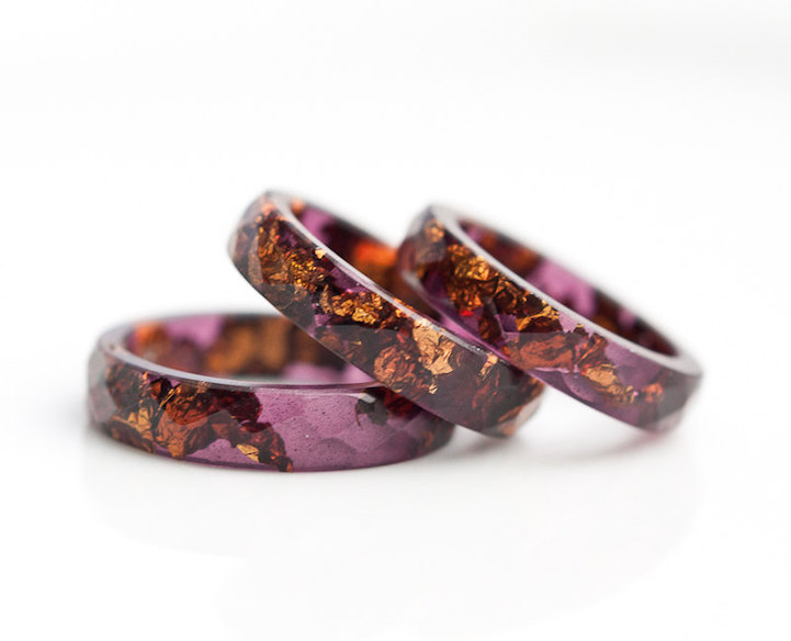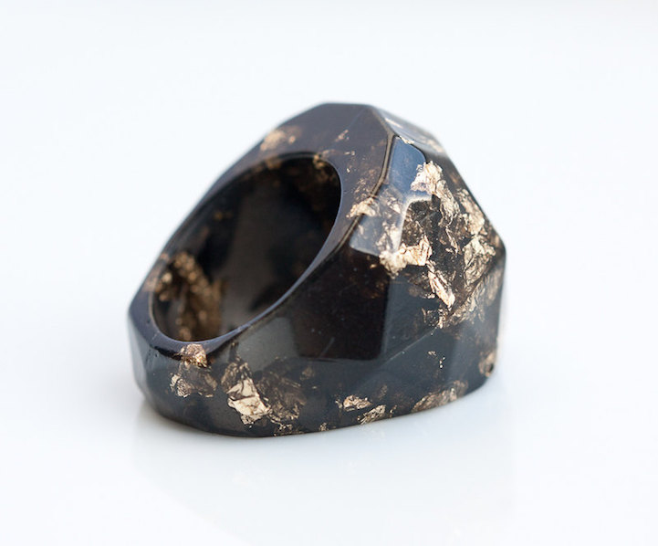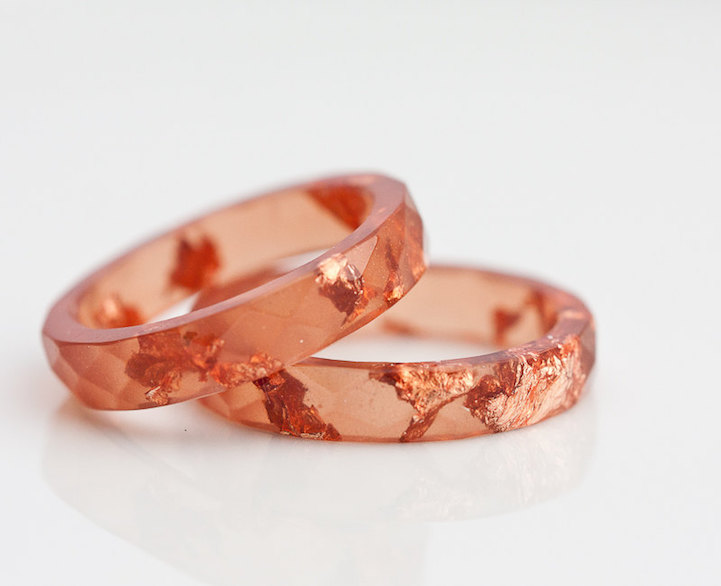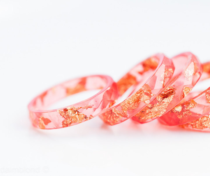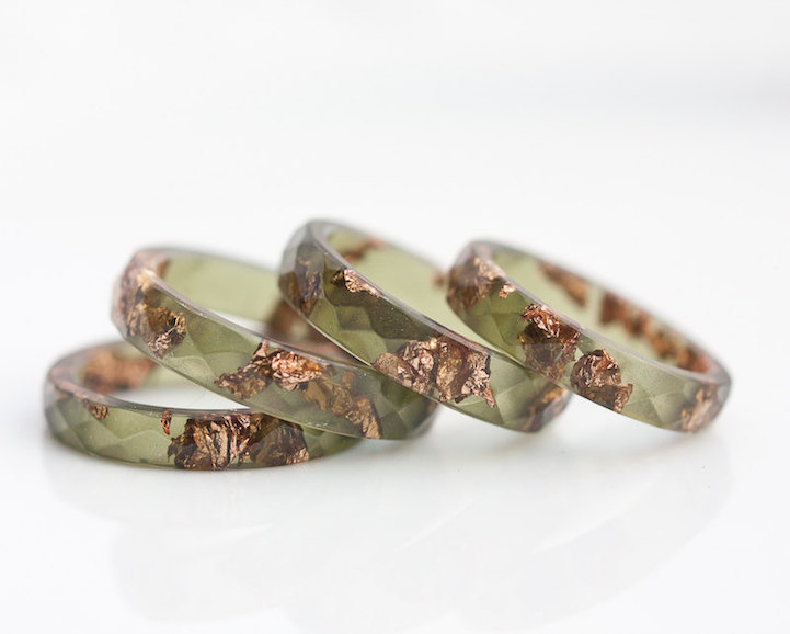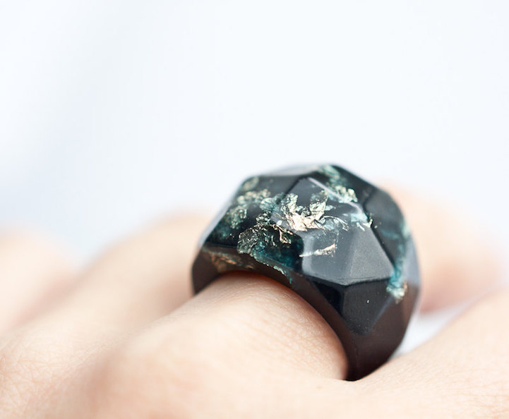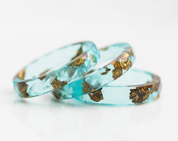 Gueno creates all of her jewelry by hand. She first creates a cast in a silicone mold and then pours the resin and flakes to form its shape. After it has dried, she sands and polishes every piece. Because of this DIY approach, each ring is slightly different and totally unique. Check out more of her creations–resin and non-resin–on Etsy.