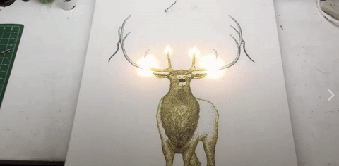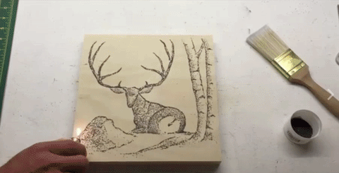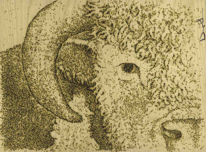 Working under the name Paint With Gunpowder, Shervin meticulously assembles ammunition on wood and canvas. It portrays animal portraits, like the creatures that live around the Grand Tetons where he grew up and still resides. Once the dust-like particles are arranged into owls, moose, and elk, Shervin takes a flame to one corner of a piece. From there, it erupts into a small but manageable fire and travels throughout the entire composition, burning the image into the surface.
