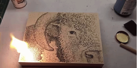 The results, which showcase a stipple-like effect, are then burned into the surface: