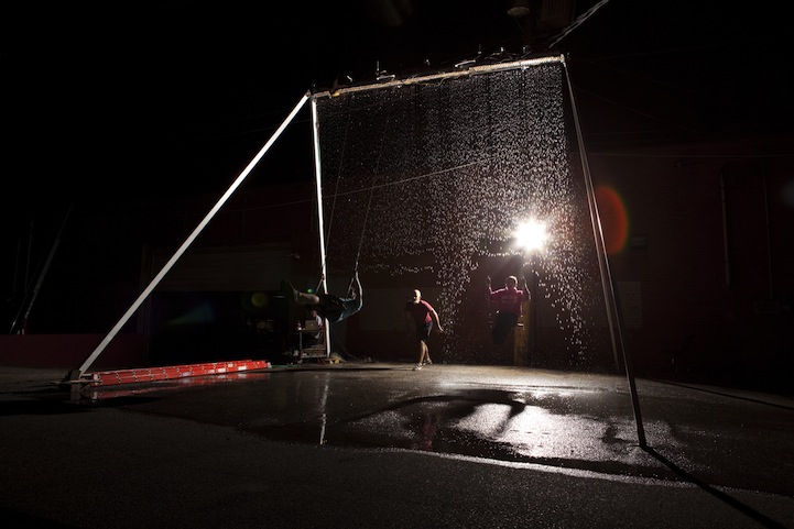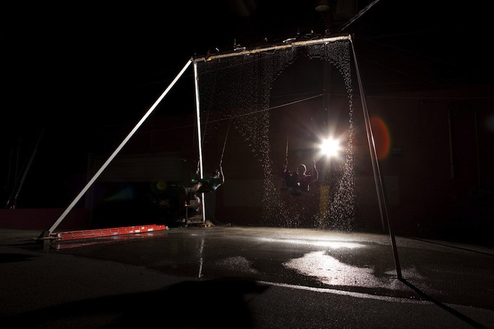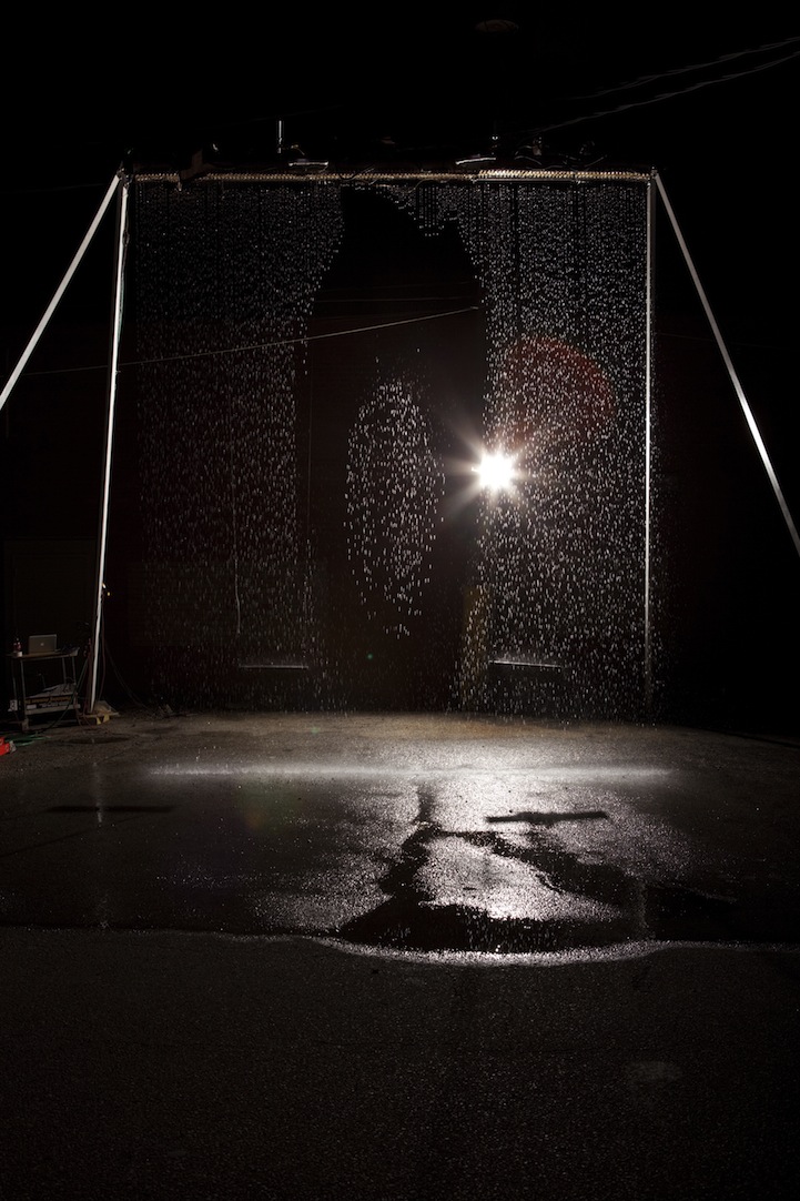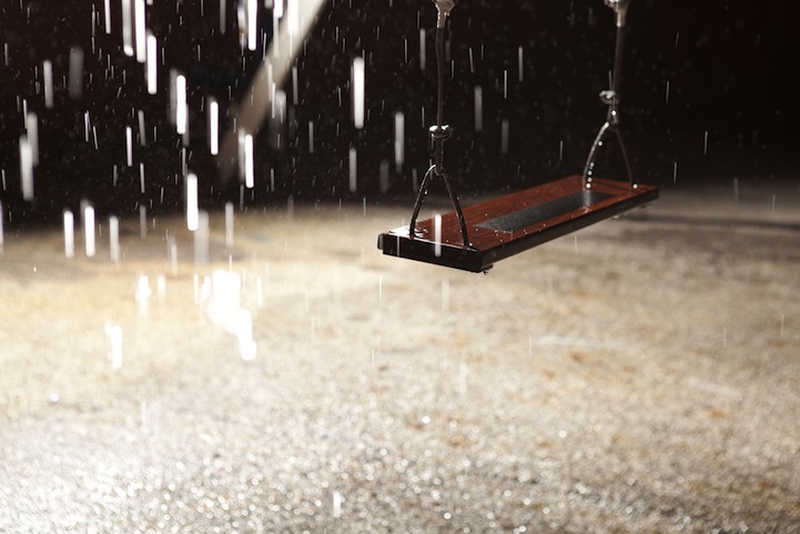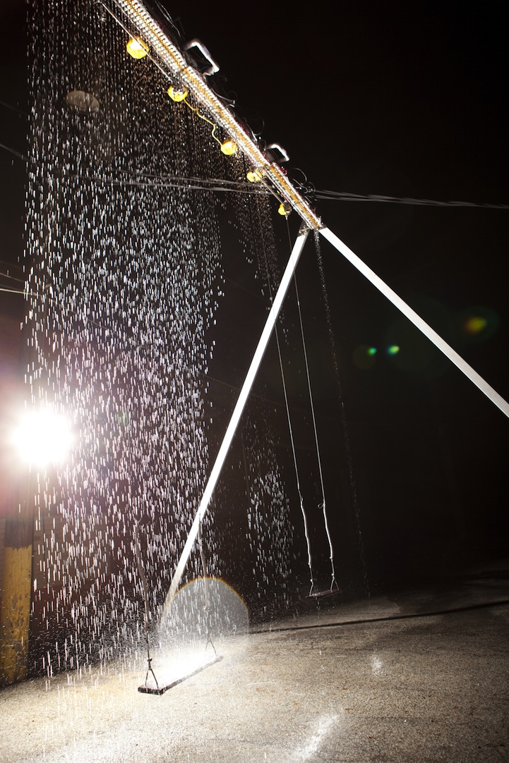 The steel framed swing set uses 273 solenoid valves, located at the top of the installation, where water drops come streaming. Each valve operates according to a computerized sensor that calculates the rider's speed and angle, determining when to shut the water off, providing a window where a person can swing through without getting wet. It reminds us of the mystical indoor Rain Room where visitor's don't get wet.
