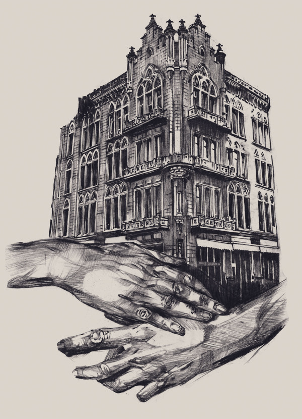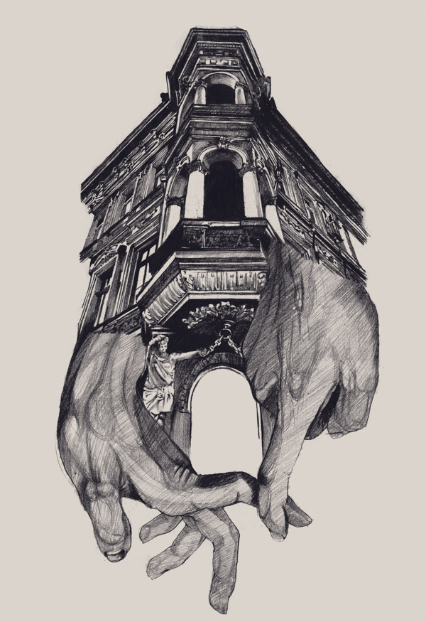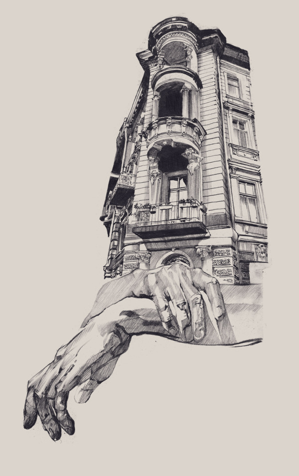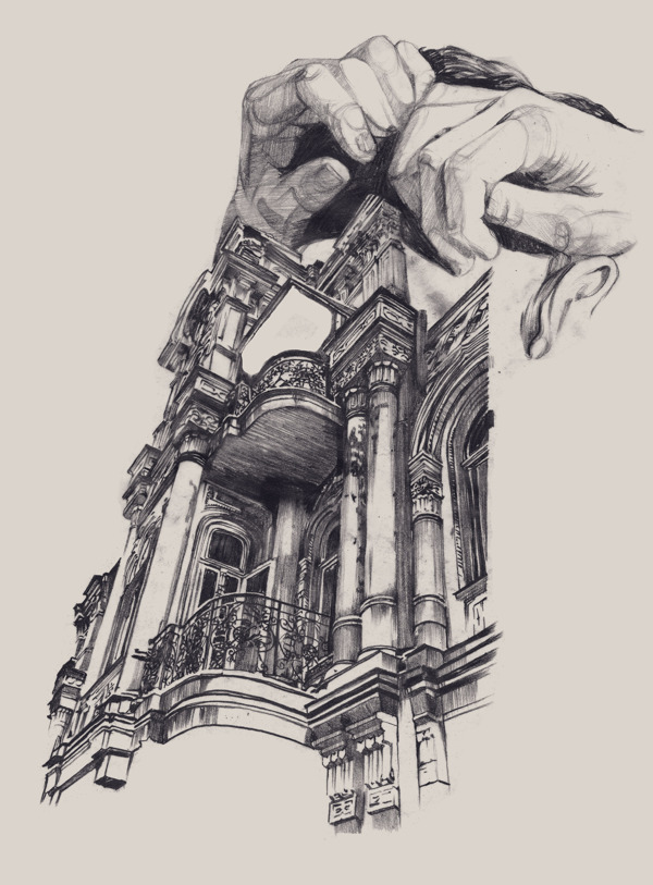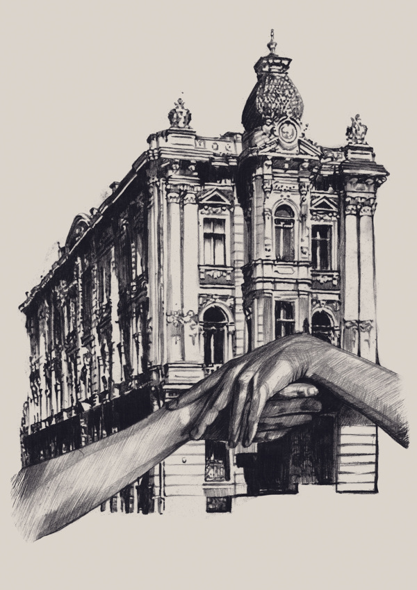 ARCHITECTURE odessa is a series of illustrations by Ukranian artist Dasha Pliska that creatively combines architecture with human hands. Her drawings present an artistic view of hands cradling, carrying, resting on, and seemingly assembling old buildings found in the city of Odessa, Ukraine. There is a brilliant balance of realism and sketchbook etchings to the surreal images that makes them all the more appealing.